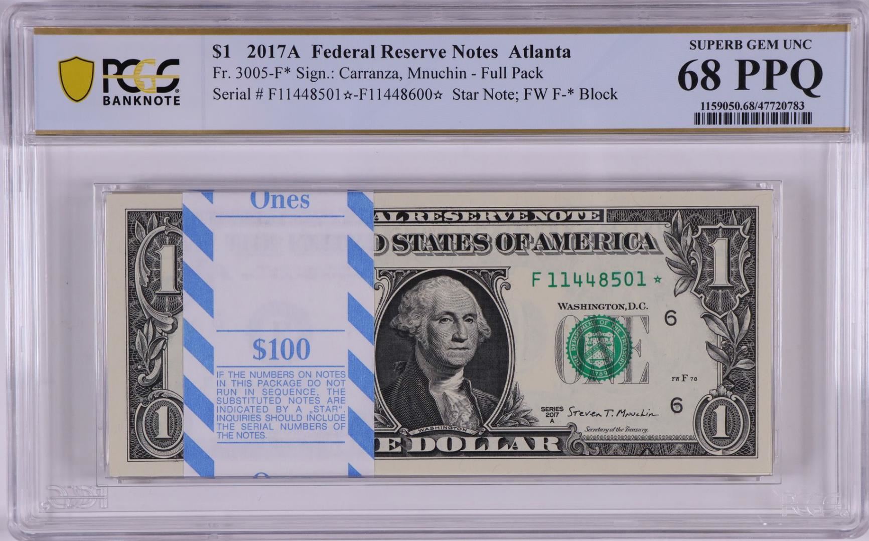 One Pack 2017A $1 Federal Reserve STAR Notes Atlanta Fr.3005-F* PCGS Superb Gem UNC 68PPQ. PCGS Graded.