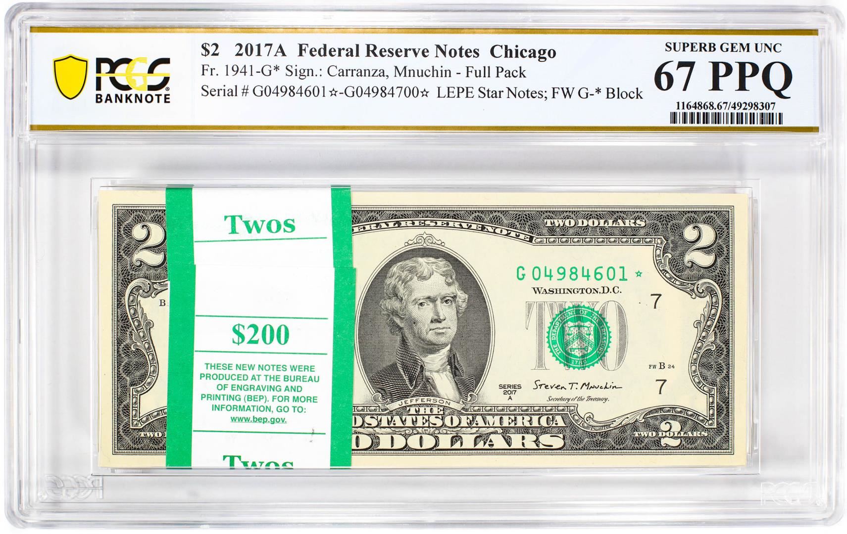 One Pack 2017A $2 Federal Reserve STAR Notes Chicago Fr.1941-G* PCGS Superb Gem UNC 67PPQ. PCGS Graded.