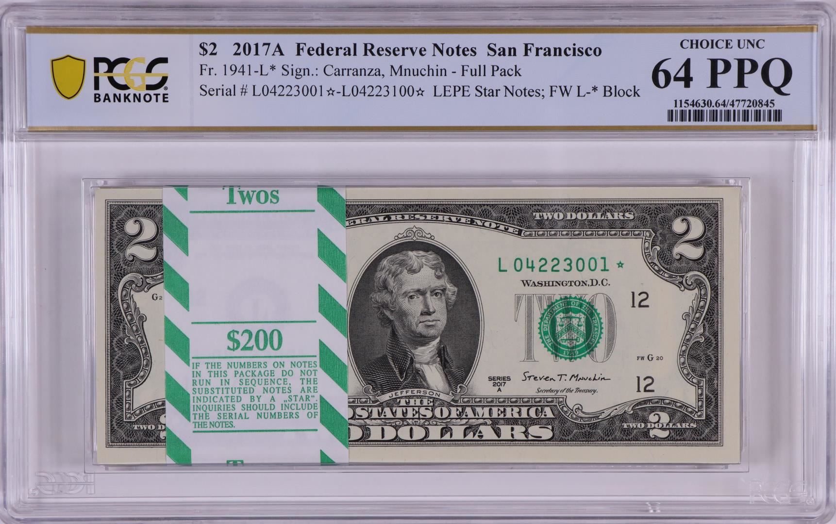 One Pack 2017A $2 Federal Reserve STAR Notes SF Fr.1941-L* PCGS Choice Uncirculated 64PPQ. PCGS Graded.