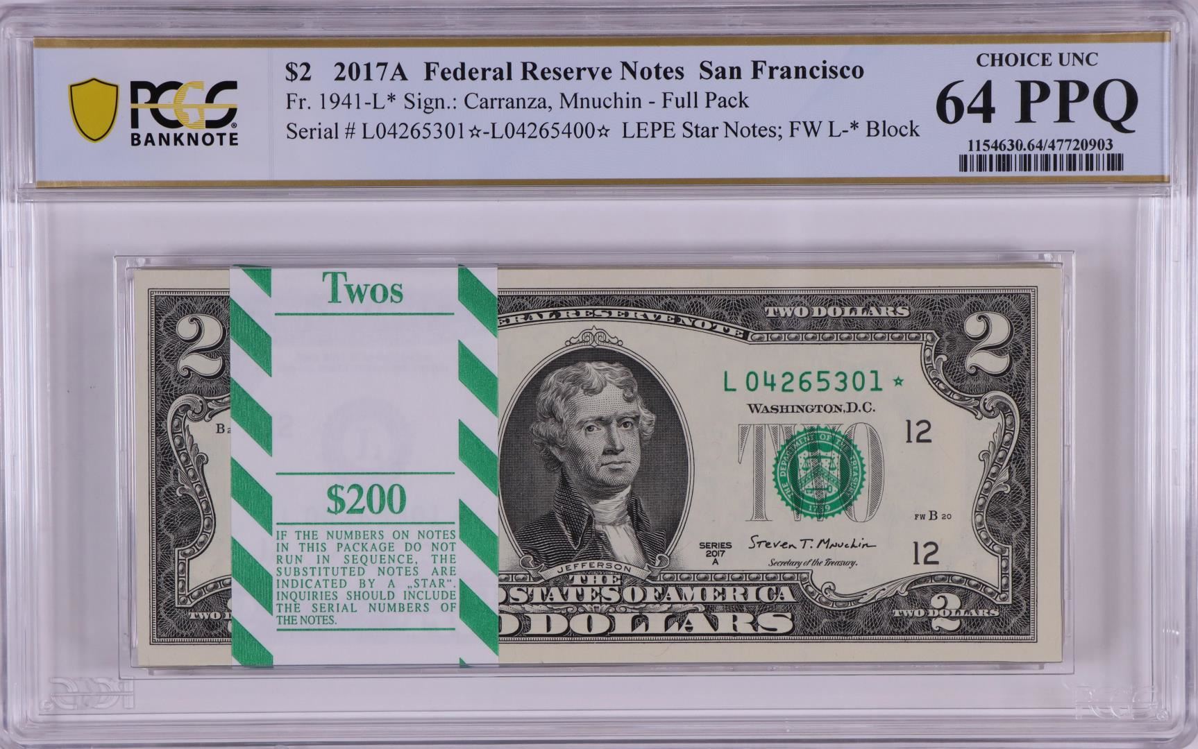 Pack 2017A $2 Federal Reserve STAR Notes SF Fr.1941-L* PCGS Choice Uncirculated 64PPQ