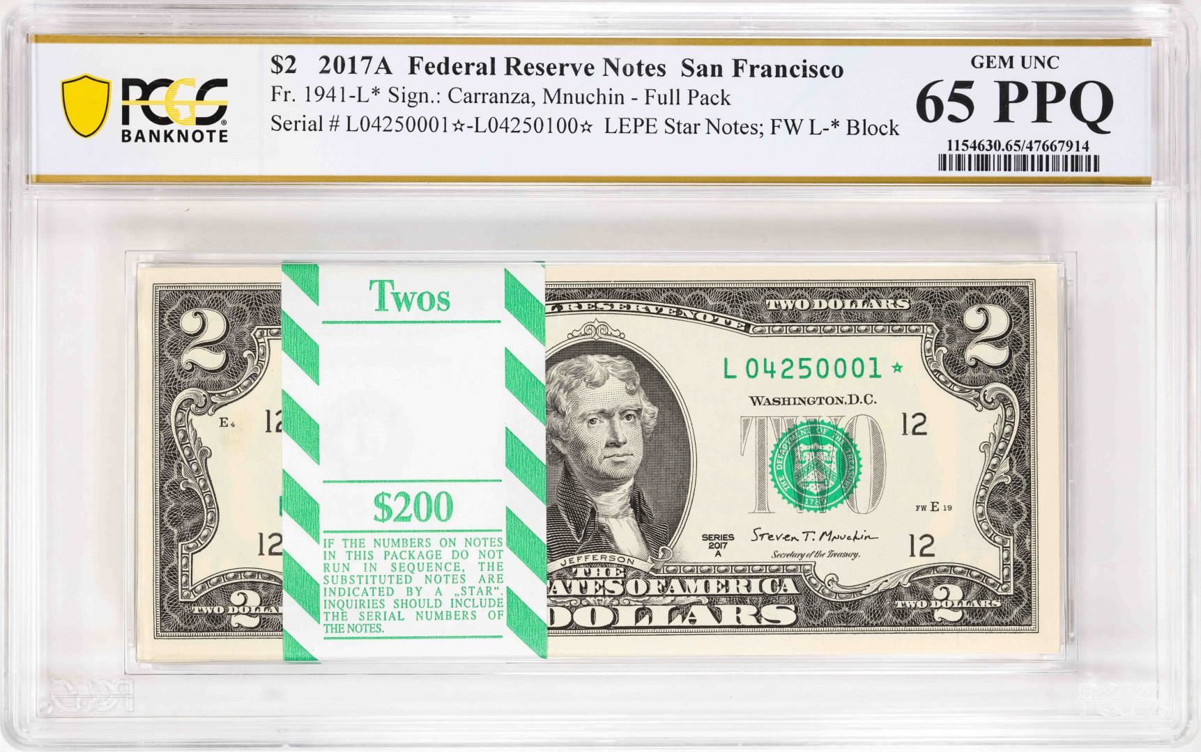 One Pack 2017A $2 Federal Reserve STAR Notes SF Fr.1941-L* PCGS Gem Uncirculated 65PPQ. PCGS Graded.