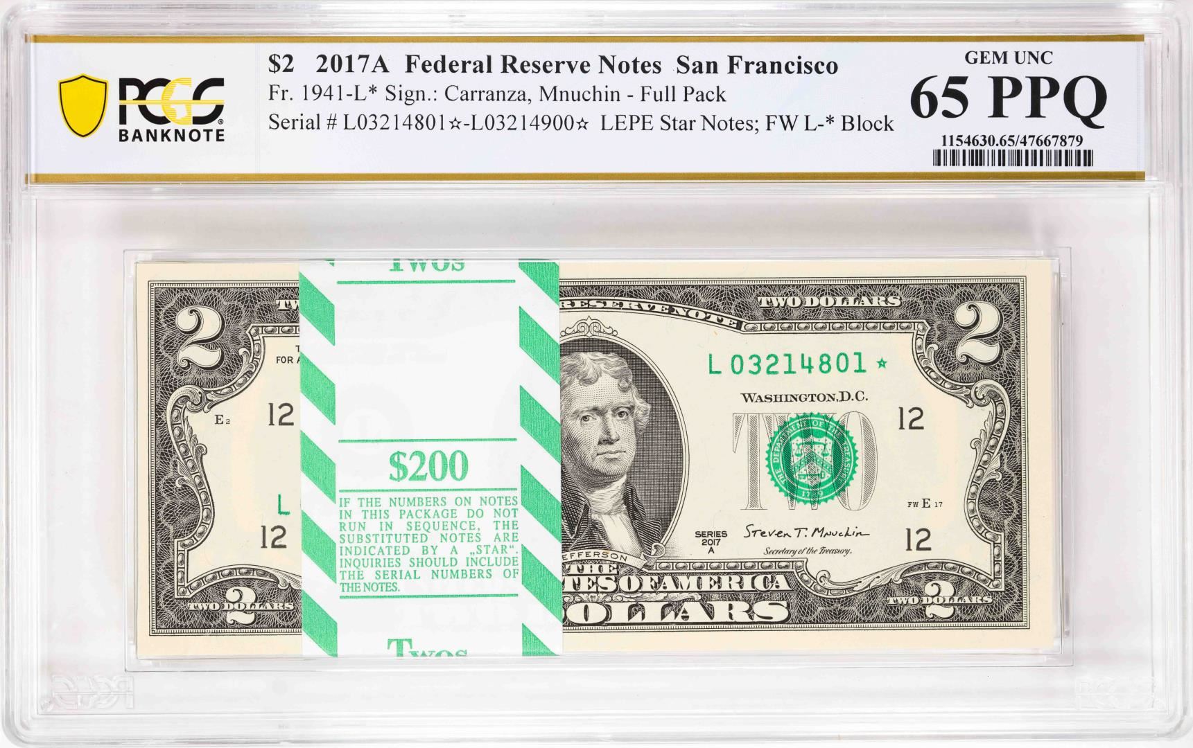 One Pack 2017A $2 Federal Reserve STAR Notes SF Fr.1941-L* PCGS Gem Uncirculated 65PPQ. PCGS Graded.