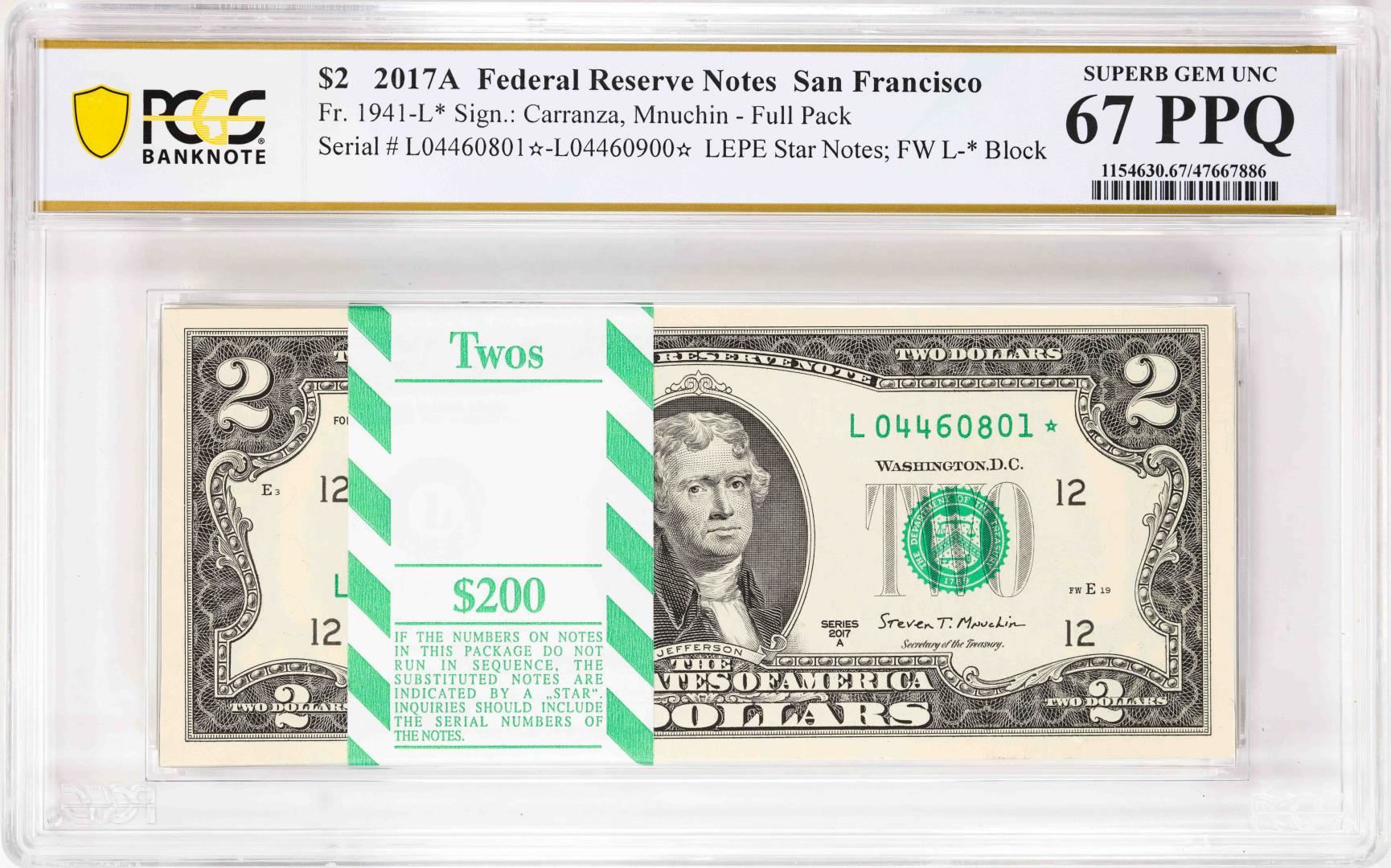 One Pack 2017A $2 Federal Reserve STAR Notes SF Fr.1941-L* PCGS Superb Gem Unc 67PPQ. PCGS Graded.