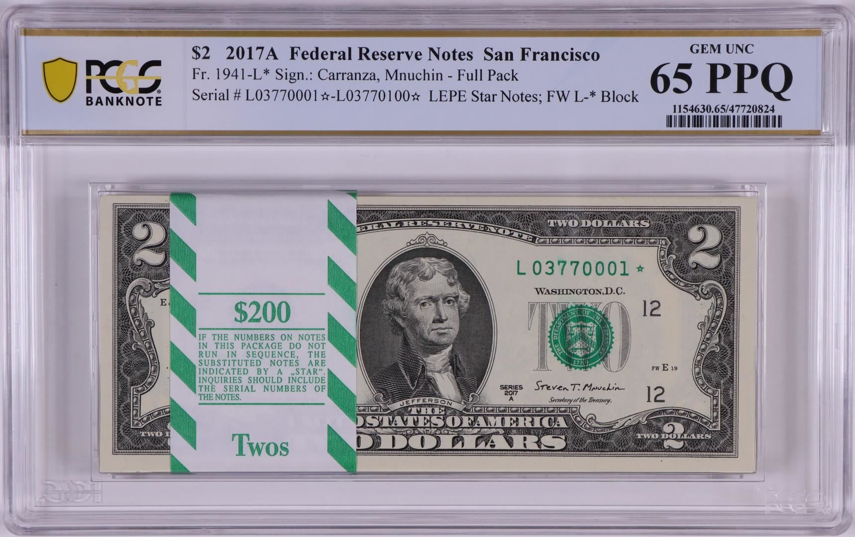One Pack 2017A $2 Federal Reserve STAR Notes San Francisco Fr.1941-L* PCGS Gem UNC 65PPQ. PCGS Graded.