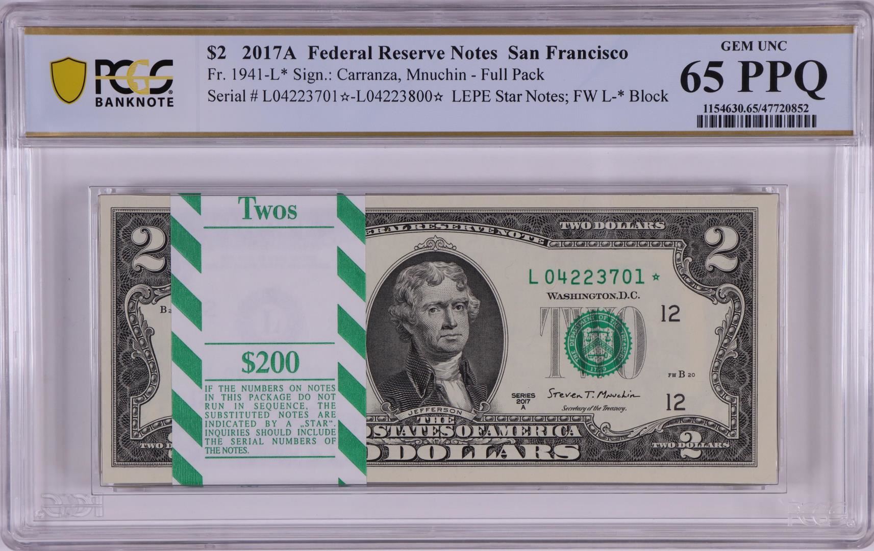 One Pack 2017A $2 Federal Reserve STAR Notes San Francisco Fr.1941-L* PCGS Gem UNC 65PPQ. PCGS Graded.