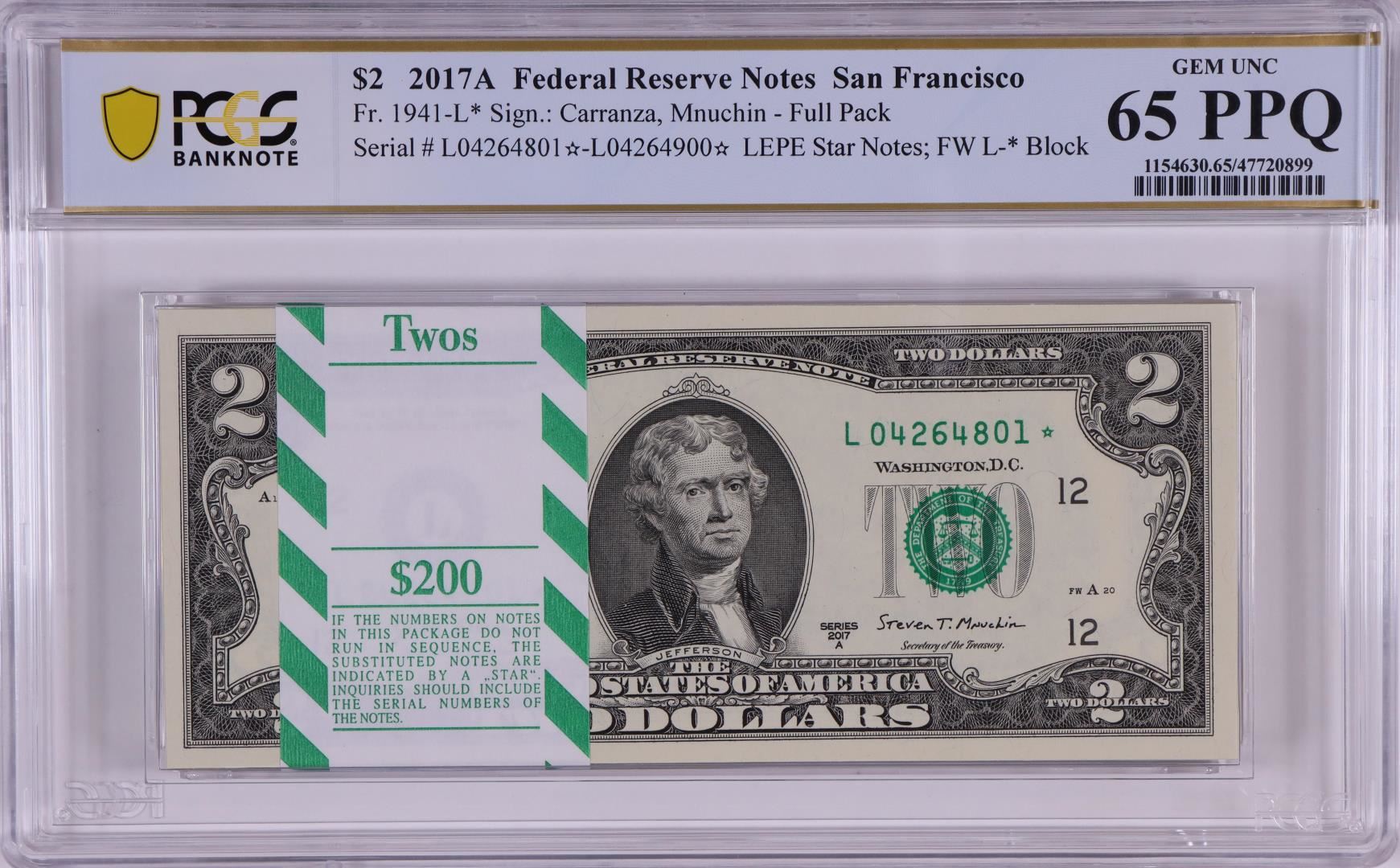 One Pack 2017A $2 Federal Reserve STAR Notes San Francisco Fr.1941-L* PCGS Gem UNC 65PPQ. PCGS Graded.