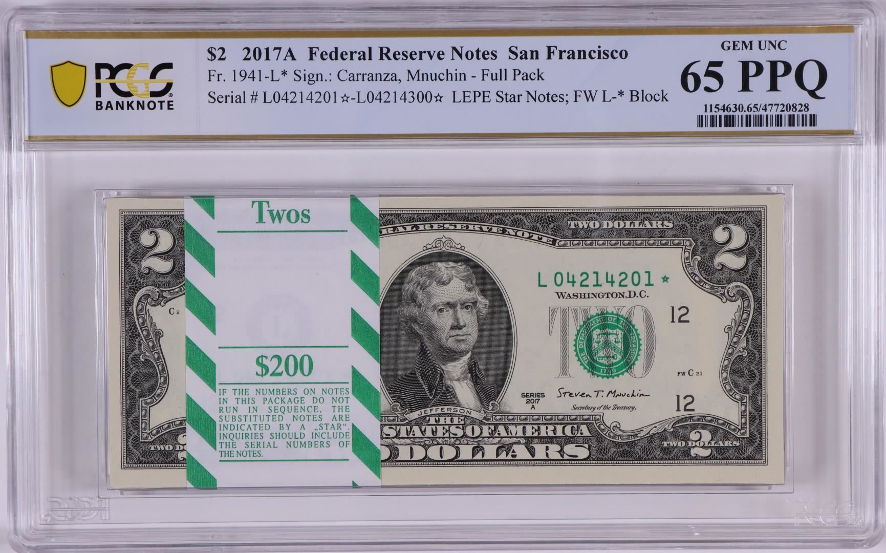 One Pack 2017A $2 Federal Reserve STAR Notes San Francisco Fr.1941-L* PCGS Gem UNC 65PPQ. PCGS Graded.