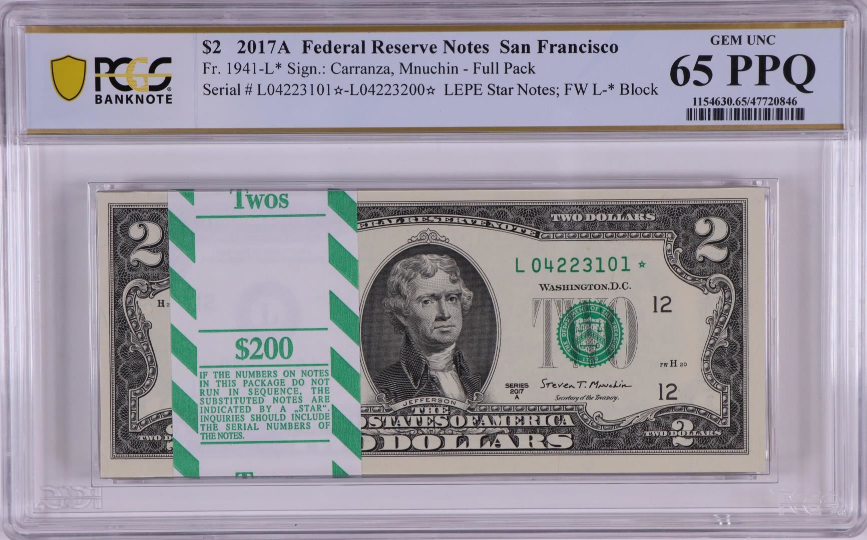One Pack 2017A $2 Federal Reserve STAR Notes San Francisco Fr.1941-L* PCGS Gem UNC 65PPQ. PCGS Graded.