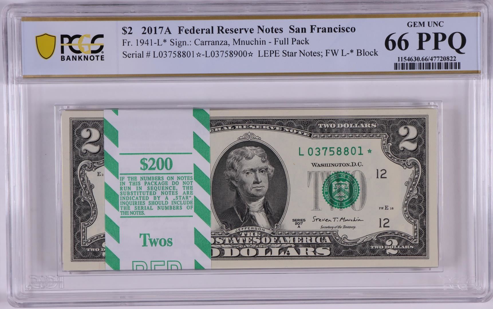 One Pack 2017A $2 Federal Reserve STAR Notes San Francisco Fr.1941-L* PCGS Gem UNC 66PPQ. PCGS Graded.