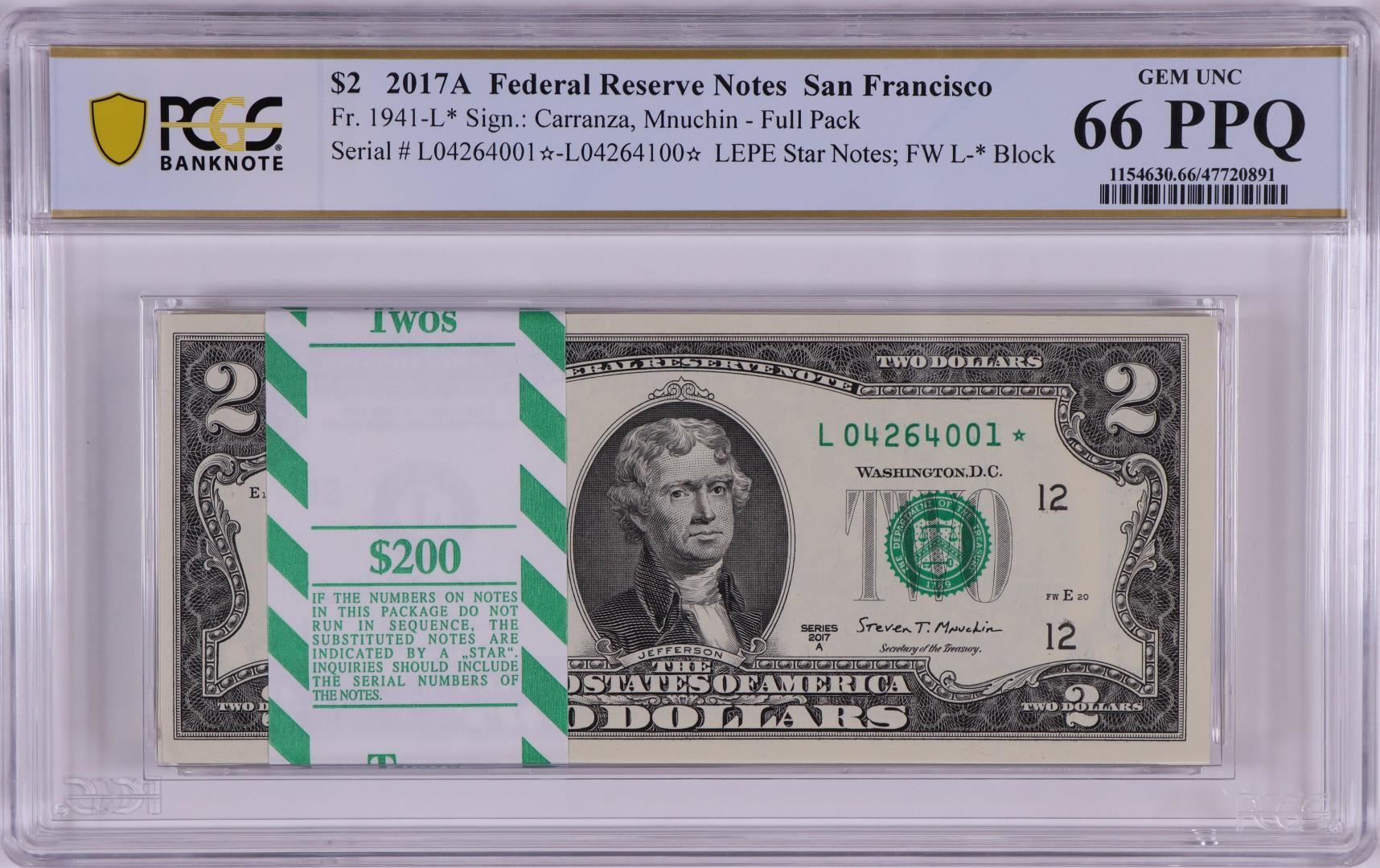 One Pack 2017A $2 Federal Reserve STAR Notes San Francisco Fr.1941-L* PCGS Gem UNC 66PPQ. PCGS Graded.