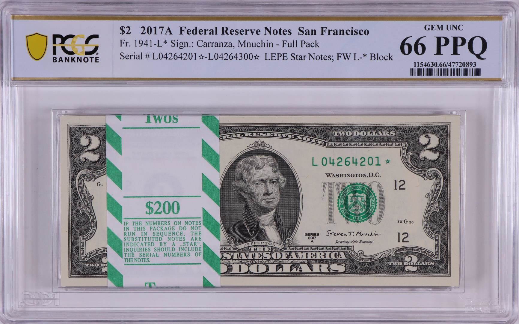 One Pack 2017A $2 Federal Reserve STAR Notes San Francisco Fr.1941-L* PCGS Gem UNC 66PPQ. PCGS Graded.
