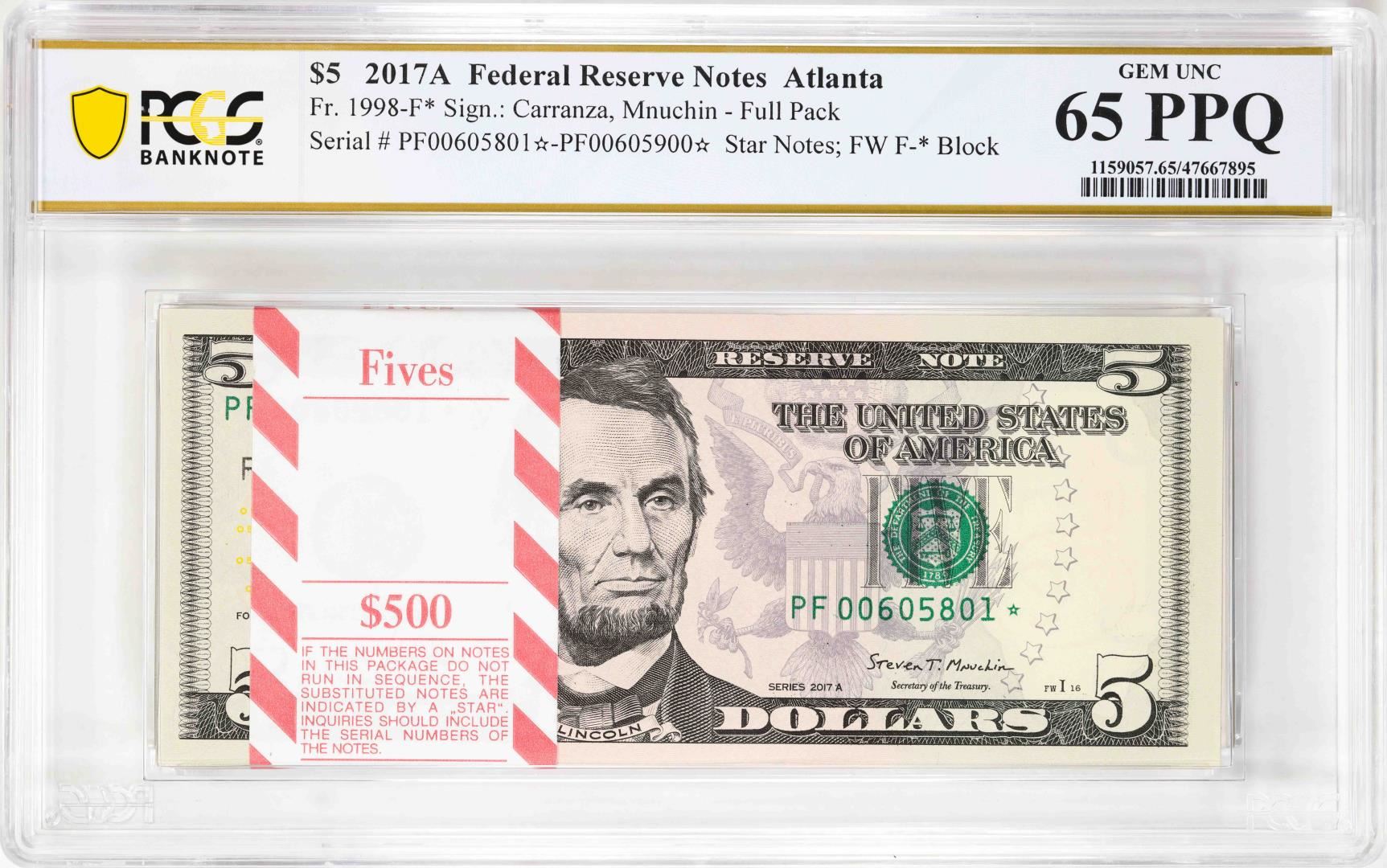 One Pack 2017A $5 Federal Reserve STAR Notes ATL Fr.1998-F* PCGS Gem Uncirculated 65PPQ. PCGS Graded.