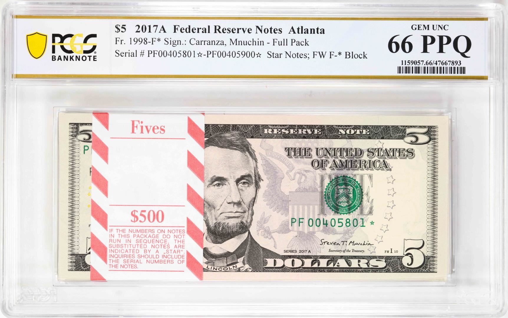 One Pack 2017A $5 Federal Reserve STAR Notes ATL Fr.1998-F* PCGS Gem Uncirculated 66PPQ. PCGS Graded.