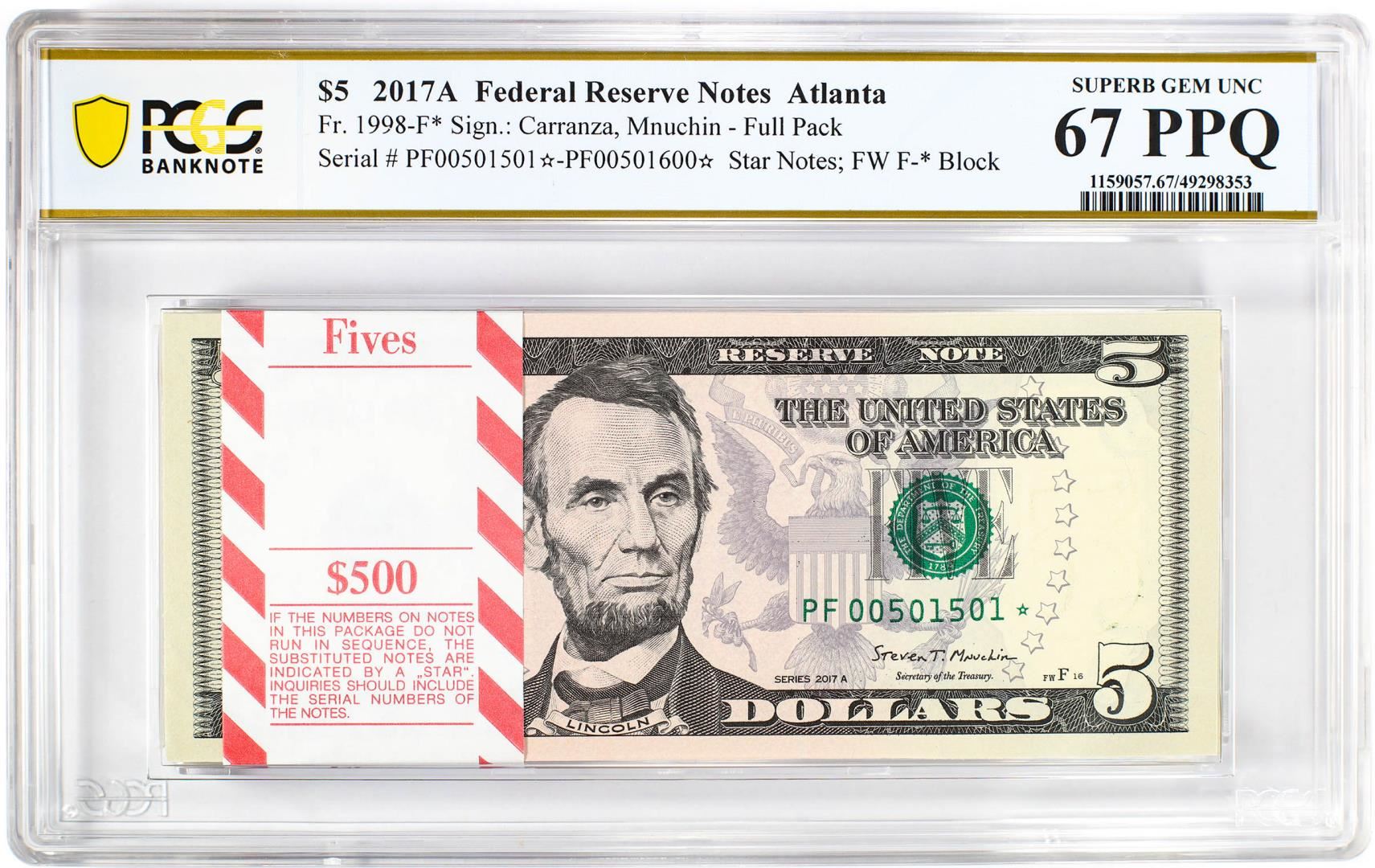 One Pack 2017A $5 Federal Reserve STAR Notes Atlanta Fr.1998-F* PCGS Superb Gem UNC 67PPQ. PCGS Graded.