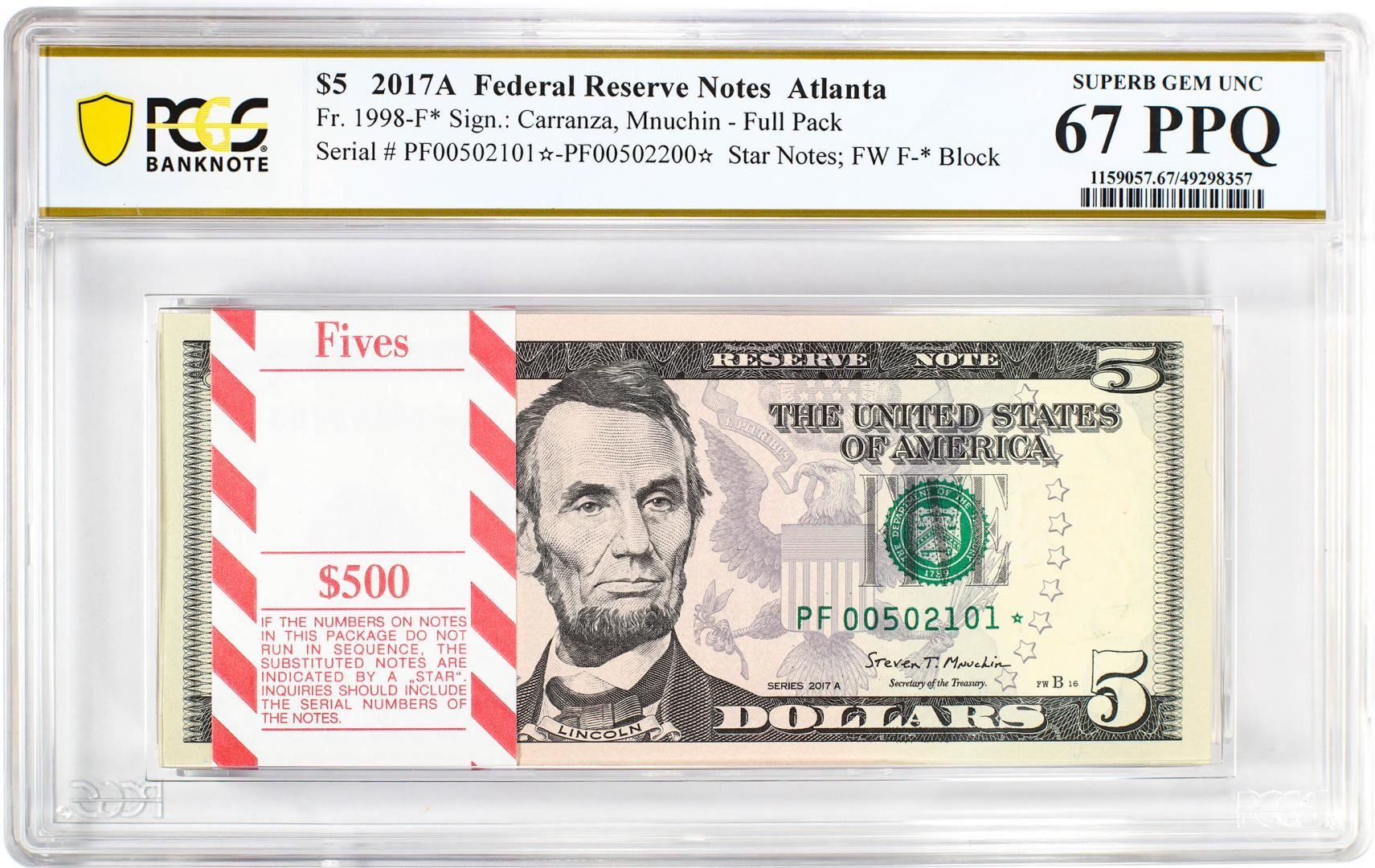One Pack 2017A $5 Federal Reserve STAR Notes Atlanta Fr.1998-F* PCGS Superb Gem UNC 67PPQ. PCGS Graded.