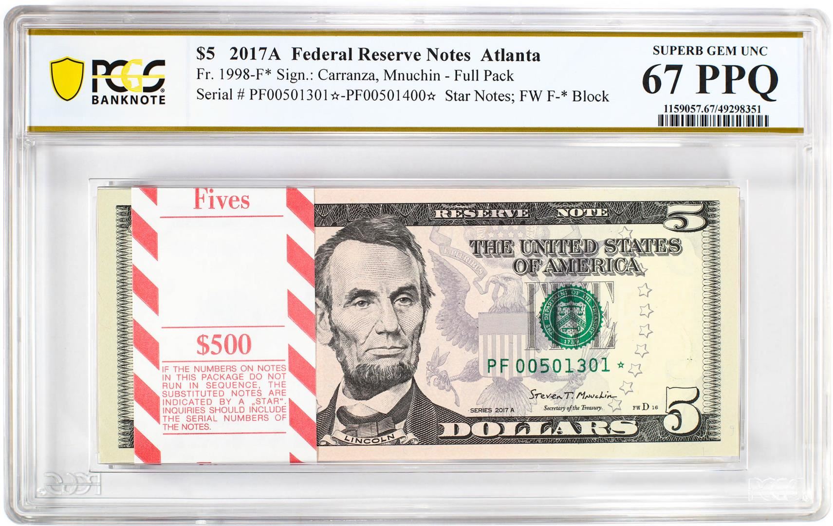 One Pack 2017A $5 Federal Reserve STAR Notes Atlanta Fr.1998-F* PCGS Superb Gem UNC 67PPQ. PCGS Graded.