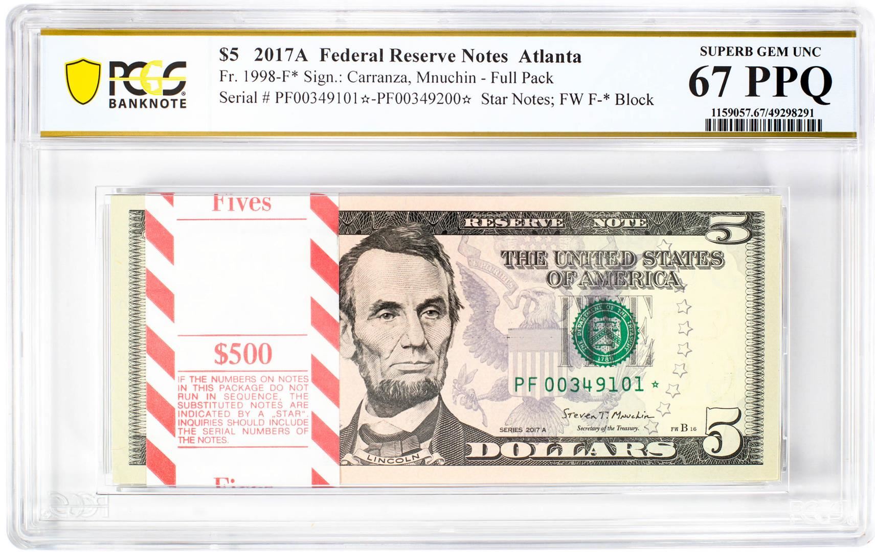One Pack 2017A $5 Federal Reserve STAR Notes Atlanta Fr.1998-F* PCGS Superb Gem UNC 67PPQ. PCGS Graded.