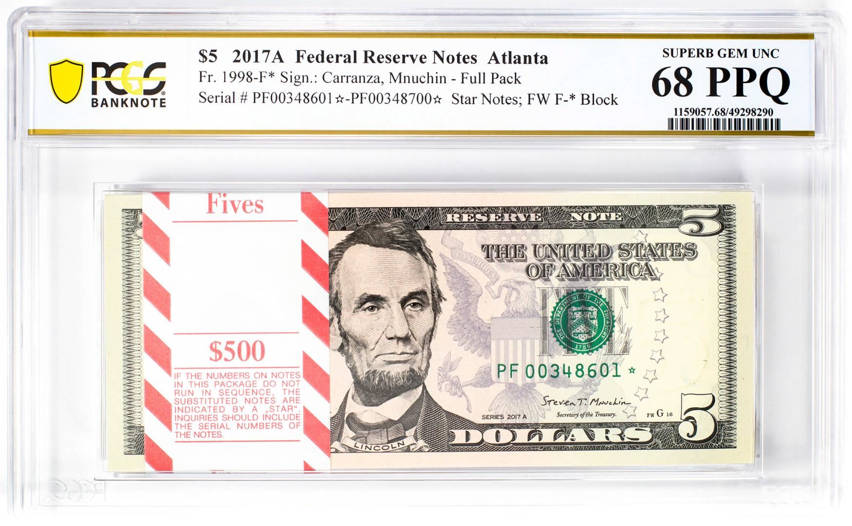One Pack 2017A $5 Federal Reserve STAR Notes Atlanta Fr.1998-F* PCGS Superb Gem UNC 68PPQ. PCGS Graded.