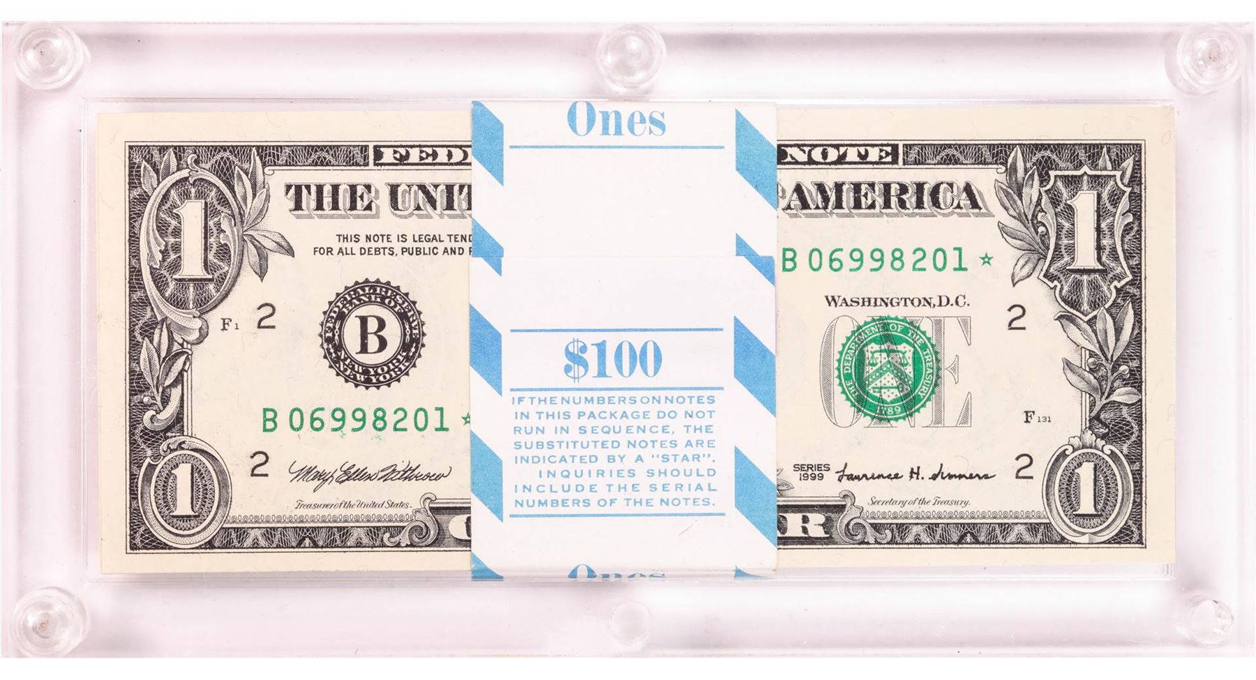 Pack of (100) 1999 $1 Federal Reserve STAR Notes New York in Capital Holder