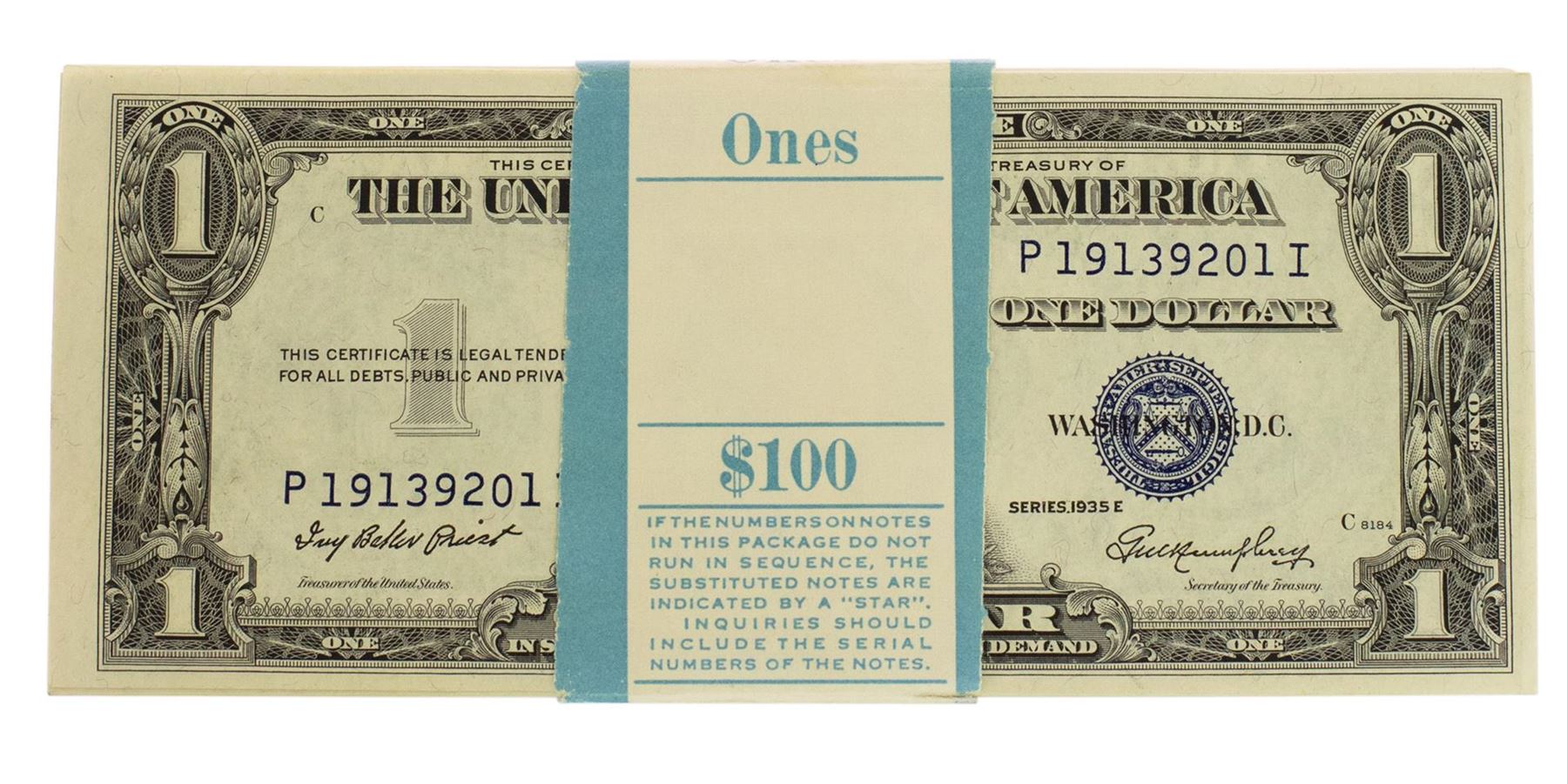 One Pack of (100) Consecutive 1935E $1 Silver Certificate Notes.