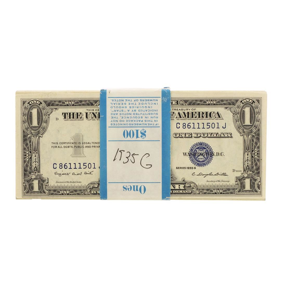 One Pack of (100) Consecutive 1935G No Motto $1 Silver Certificate Notes.