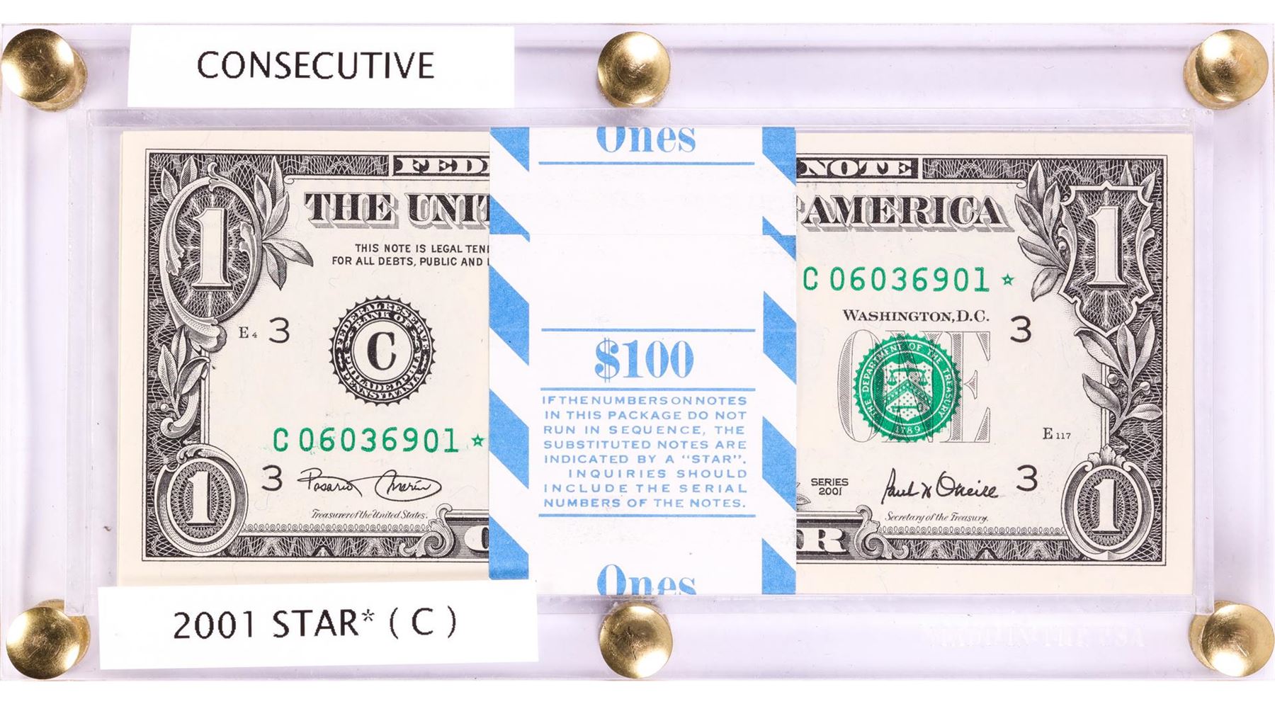 One Pack of (100) Consecutive 2001 $1 Federal Reserve STAR Notes Philadelphia in Holder.