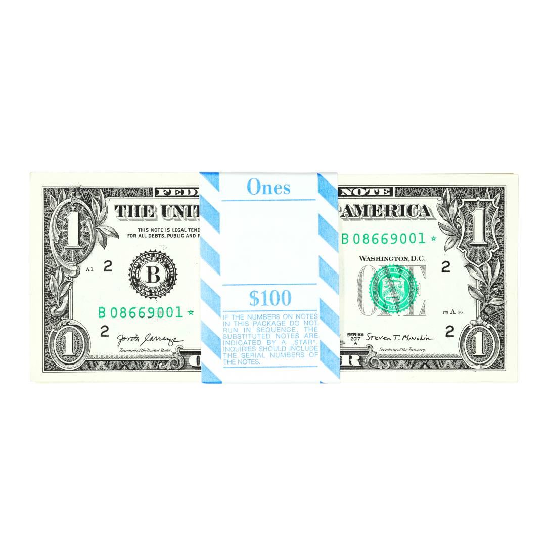 Pack of (100) Consecutive 2017A $1 Federal Reserve STAR Notes New York