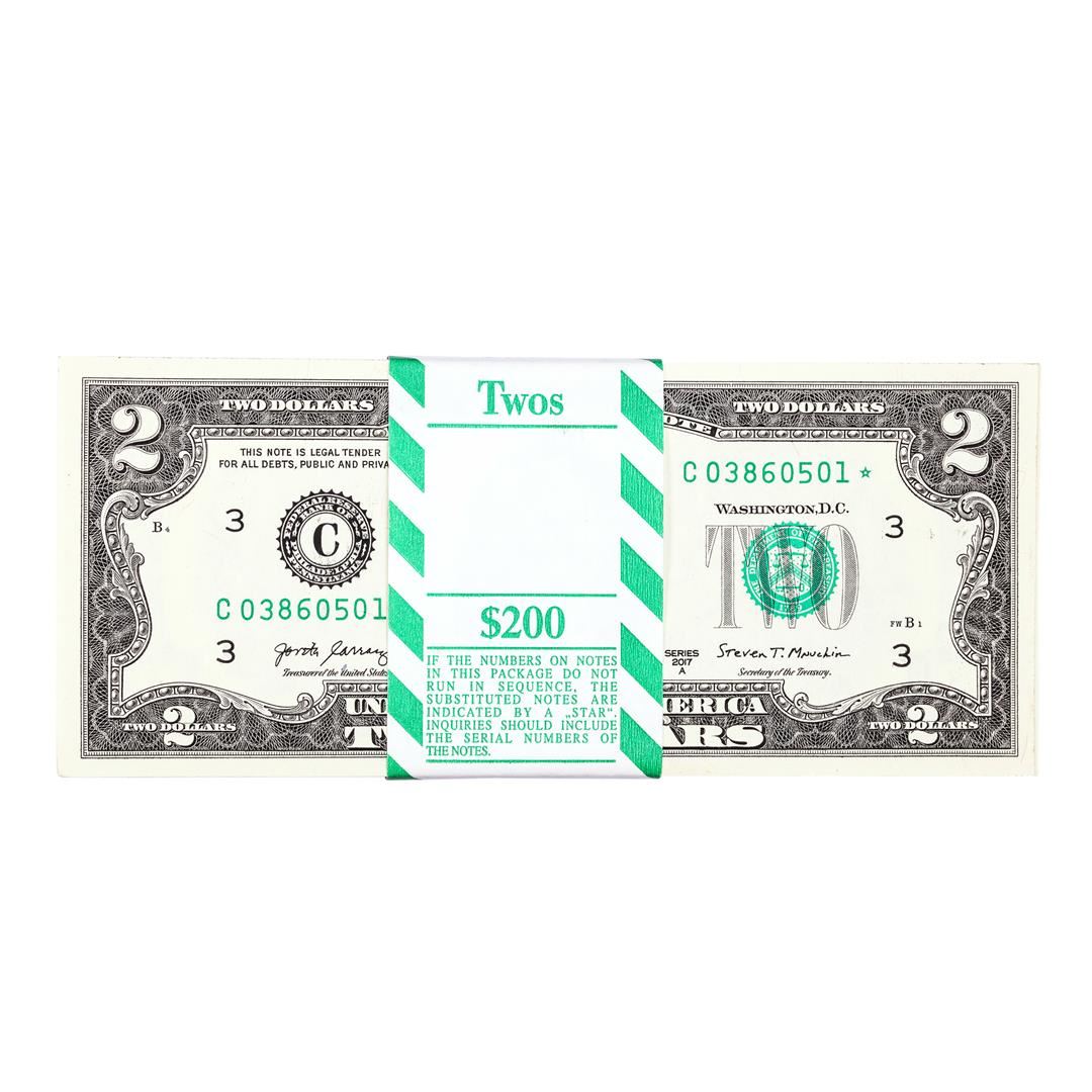 Pack of (100) Consecutive 2017A $2 Federal Reserve STAR Notes Philadelphia