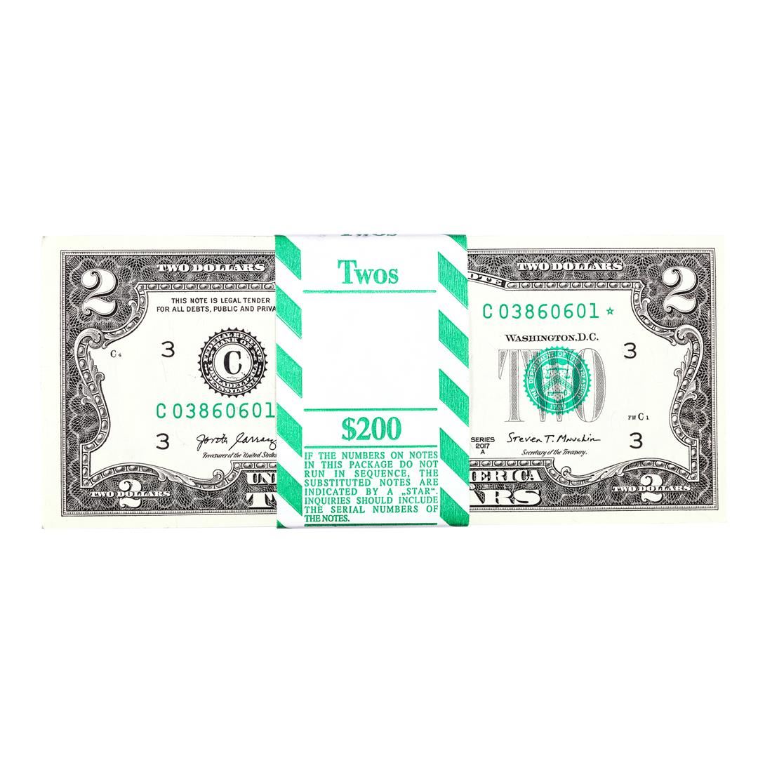 Pack of (100) Consecutive 2017A $2 Federal Reserve STAR Notes Philadelphia