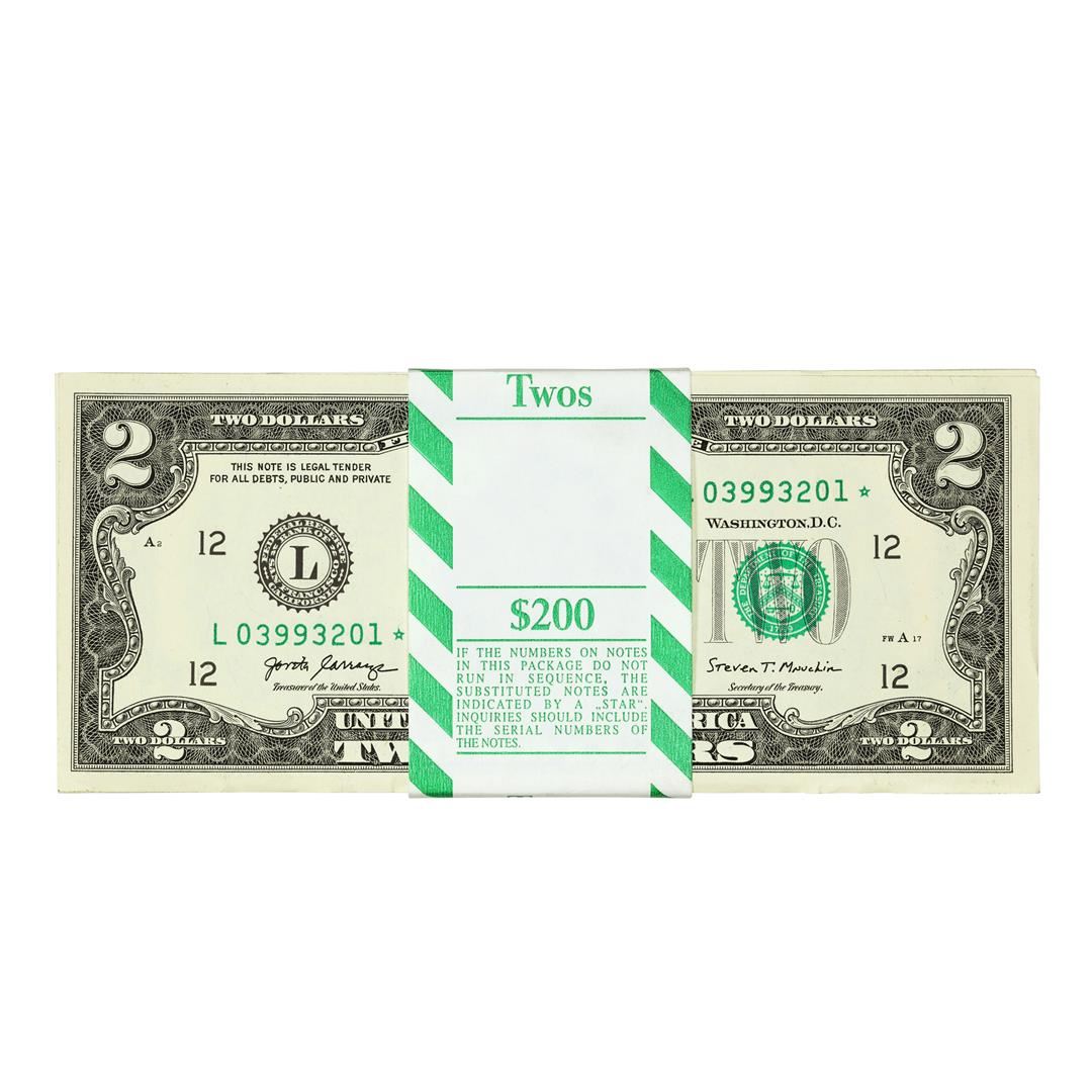 Pack of (100) Consecutive 2017A $2 Federal Reserve Star Notes San Francisco
