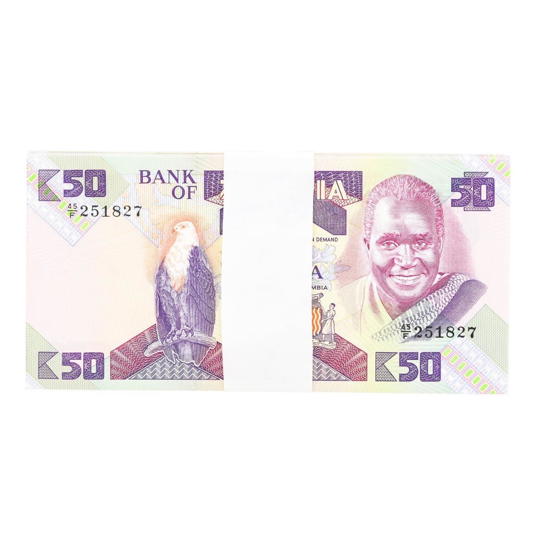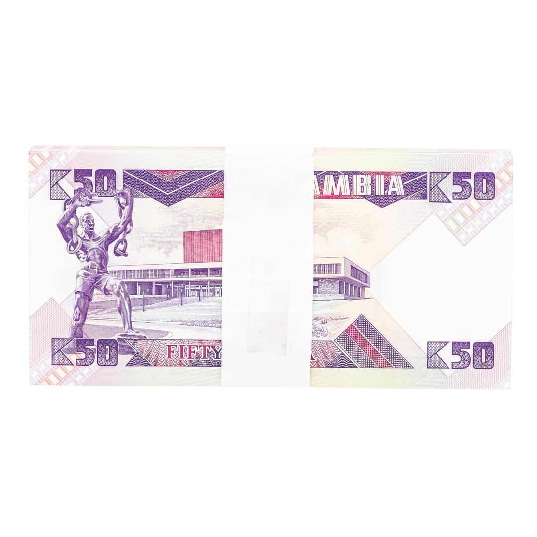 One Pack of (100) Zambia 50 Kawacha Uncirculated Notes.