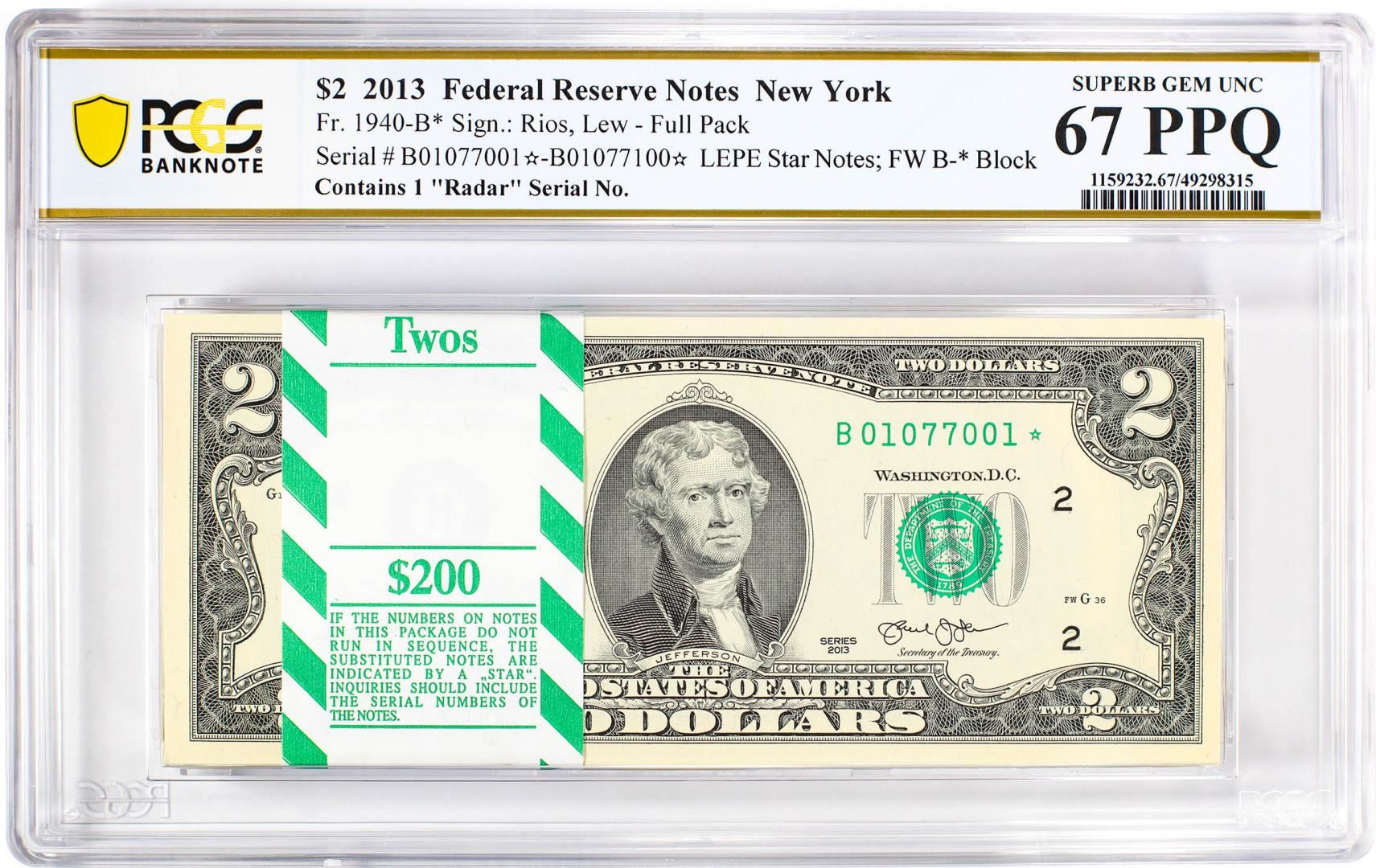 One Pack of 2013 $2 Federal Reserve STAR Notes NY Fr.1940-B* PCGS Superb Gem UNC 67PPQ. PCGS Graded.