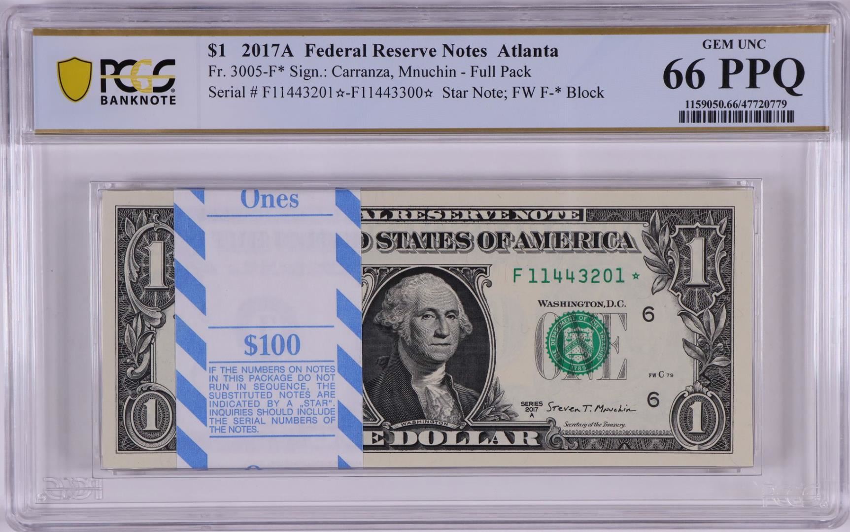 One Pack of 2017A $1 Federal Reserve STAR Notes Atlanta Fr.3005-F* PCGS Gem UNC 66PPQ. PCGS Graded.