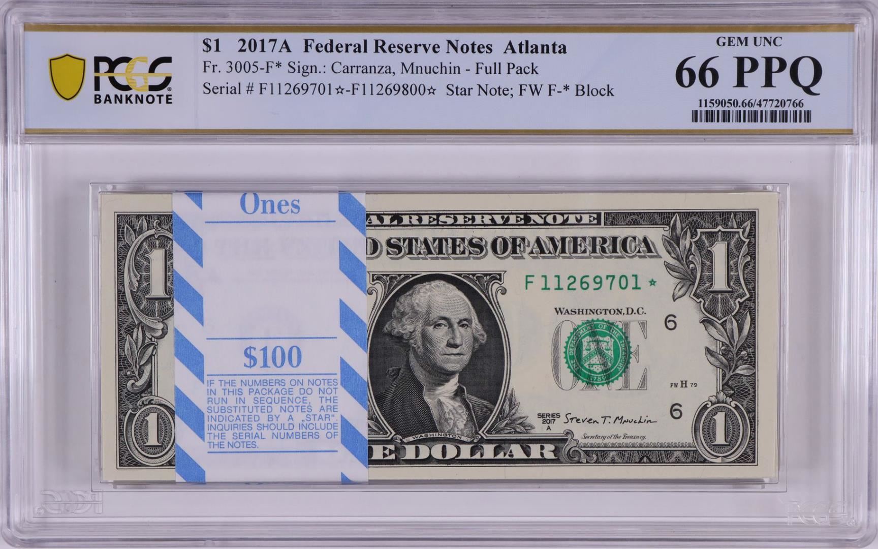 One Pack of 2017A $1 Federal Reserve STAR Notes Atlanta Fr.3005-F* PCGS Gem UNC 66PPQ. PCGS Graded.