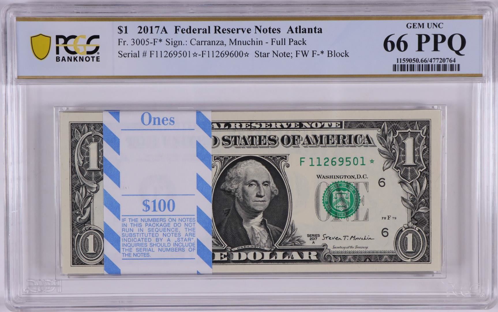 One Pack of 2017A $1 Federal Reserve STAR Notes Atlanta Fr.3005-F* PCGS Gem UNC 66PPQ. PCGS Graded.