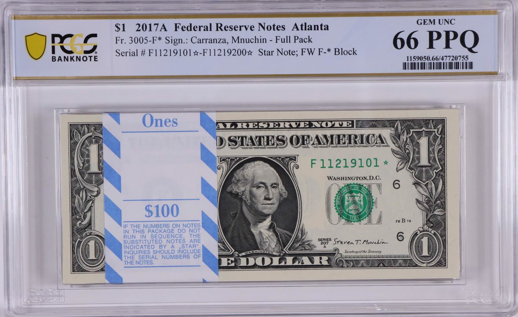 One Pack of 2017A $1 Federal Reserve STAR Notes Atlanta Fr.3005-F* PCGS Gem UNC 66PPQ. PCGS Graded.