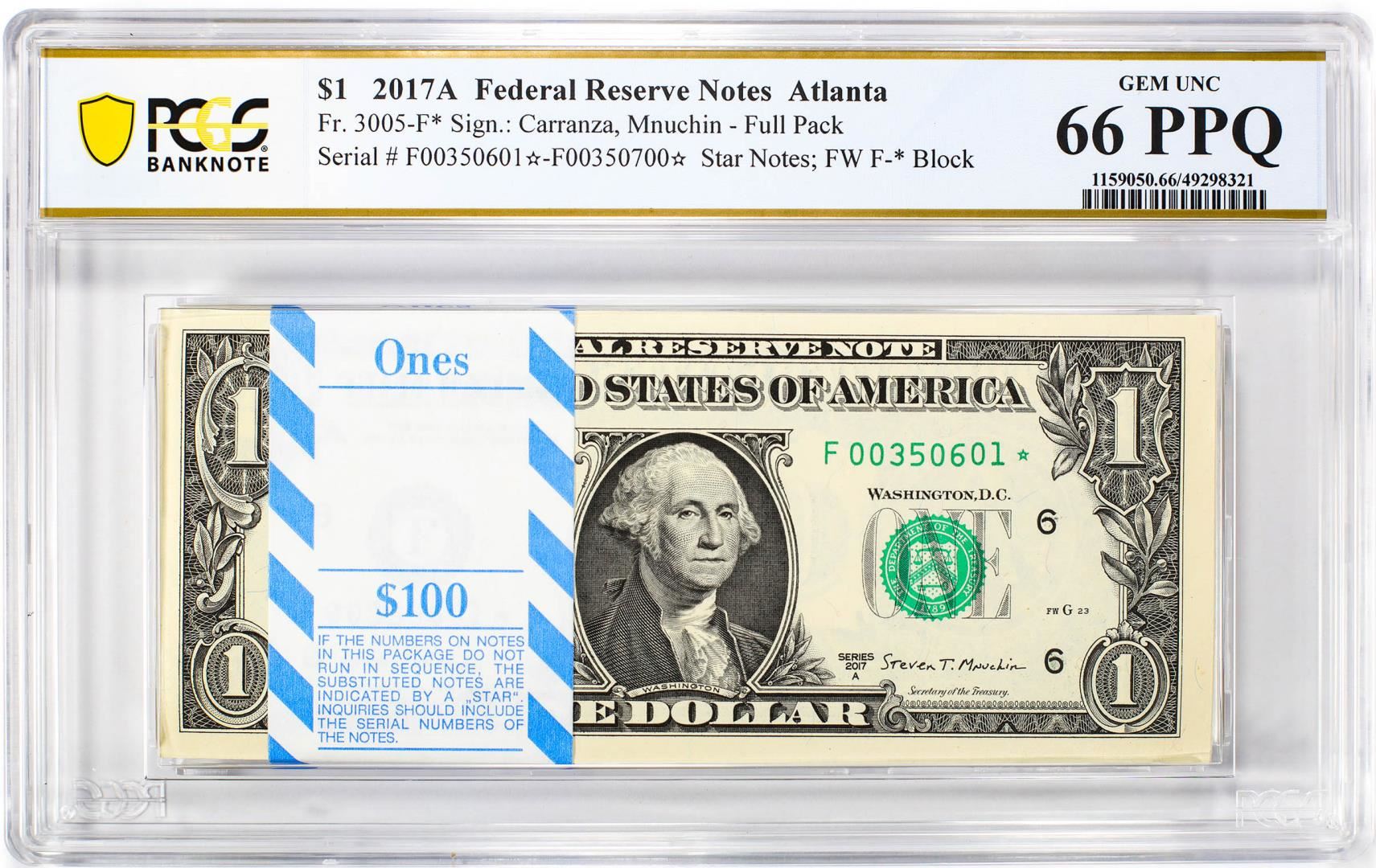 One Pack of 2017A $1 Federal Reserve STAR Notes Atlanta Fr.3005-F* PCGS Gem UNC 66PPQ. PCGS Graded.