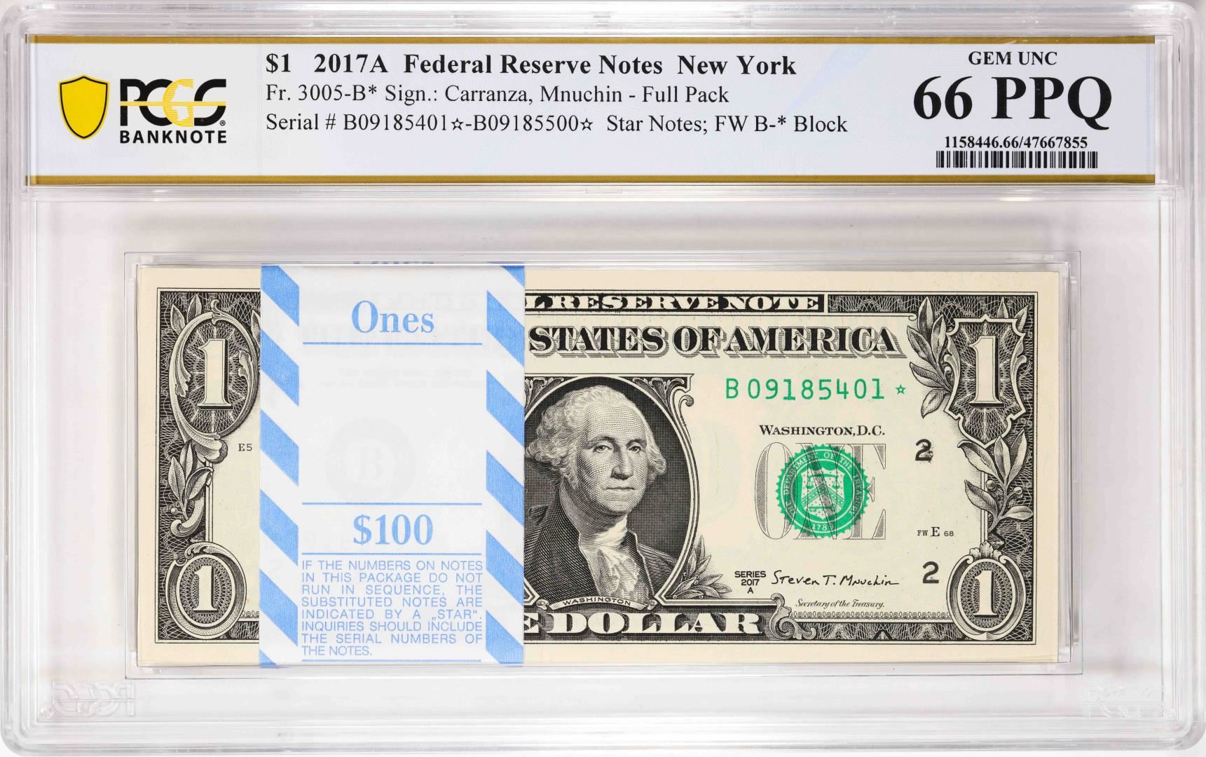 One Pack of 2017A $1 Federal Reserve STAR Notes New York Fr.3005-B* PCGS Gem Unc 66PPQ. PCGS Graded.