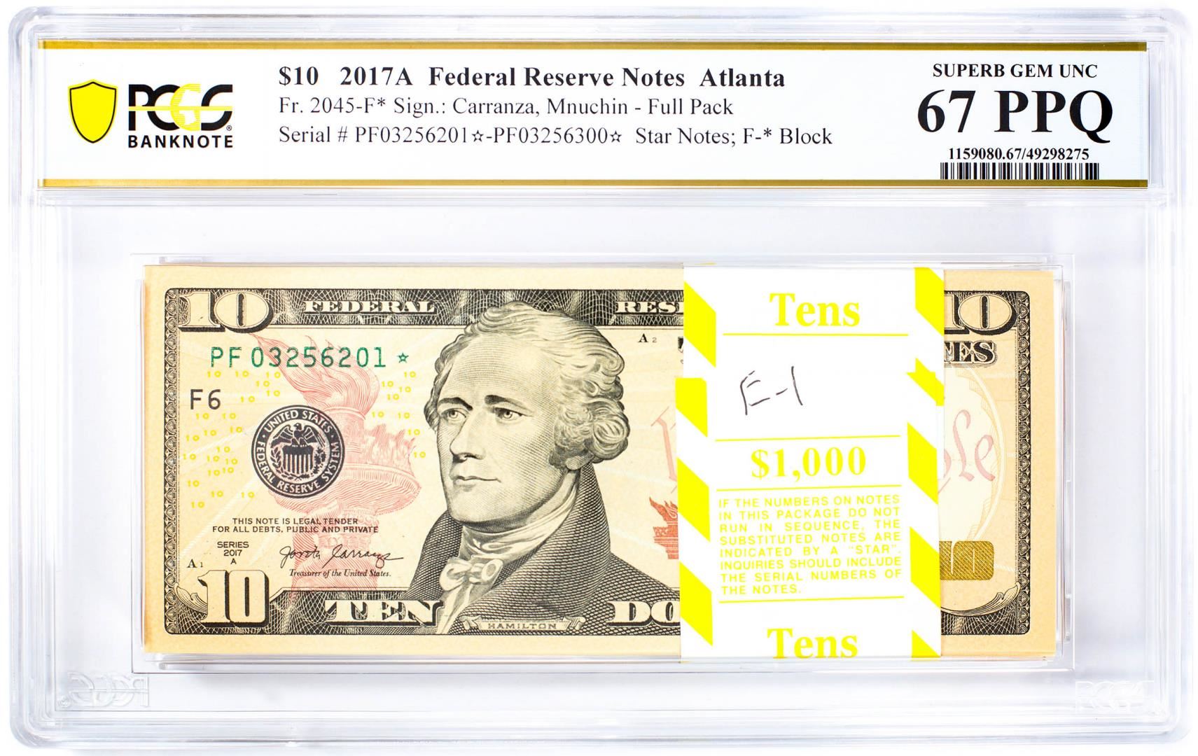 One Pack of 2017A $10 Federal Reserve STAR Notes ATL Fr.2045-F* PCGS Superb Gem UNC 67PPQ. PCGS Graded.