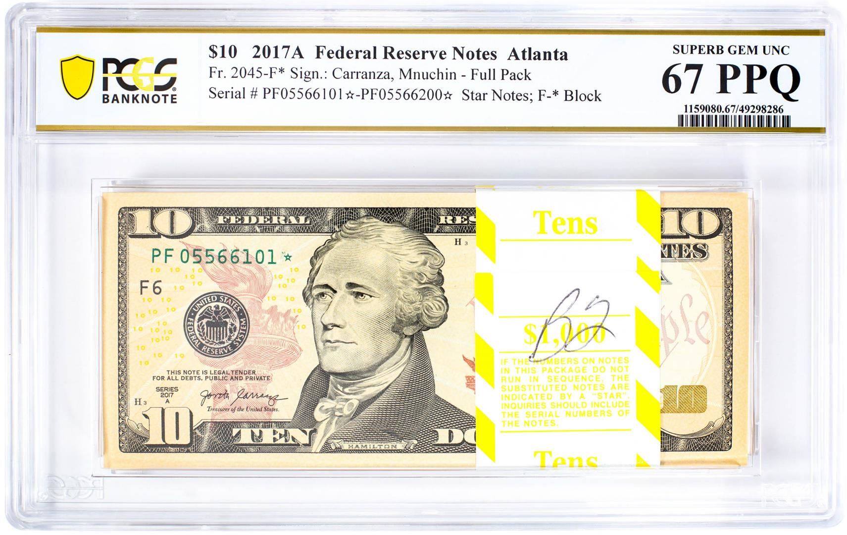One Pack of 2017A $10 Federal Reserve STAR Notes ATL Fr.2045-F* PCGS Superb Gem UNC 67PPQ. PCGS Graded.