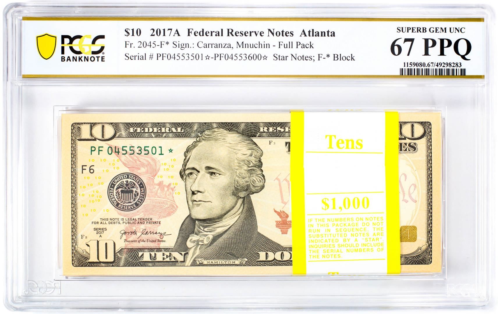 One Pack of 2017A $10 Federal Reserve STAR Notes ATL Fr.2045-F* PCGS Superb Gem UNC 67PPQ. PCGS Graded.