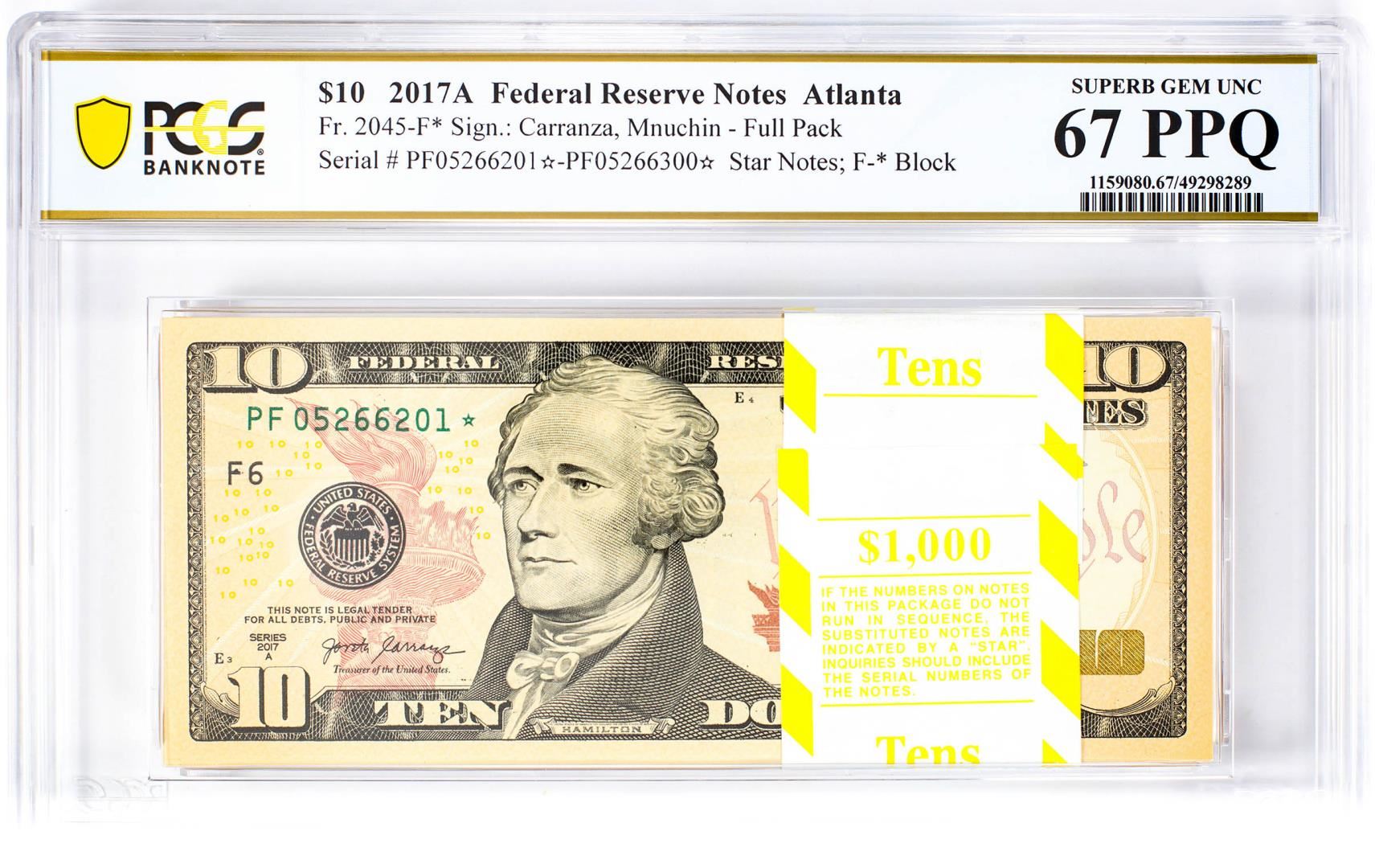 One Pack of 2017A $10 Federal Reserve STAR Notes ATL Fr.2045-F* PCGS Superb Gem UNC 67PPQ. PCGS Graded.