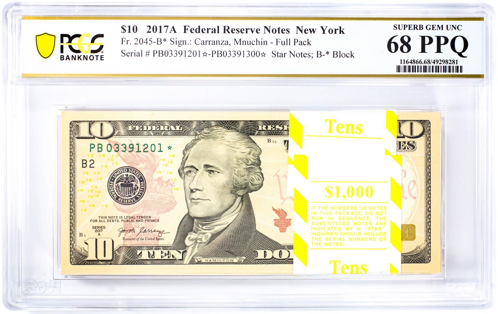 One Pack of 2017A $10 Federal Reserve STAR Notes NY Fr.2045-B* PCGS Superb Gem UNC 68PPQ. PCGS Graded.