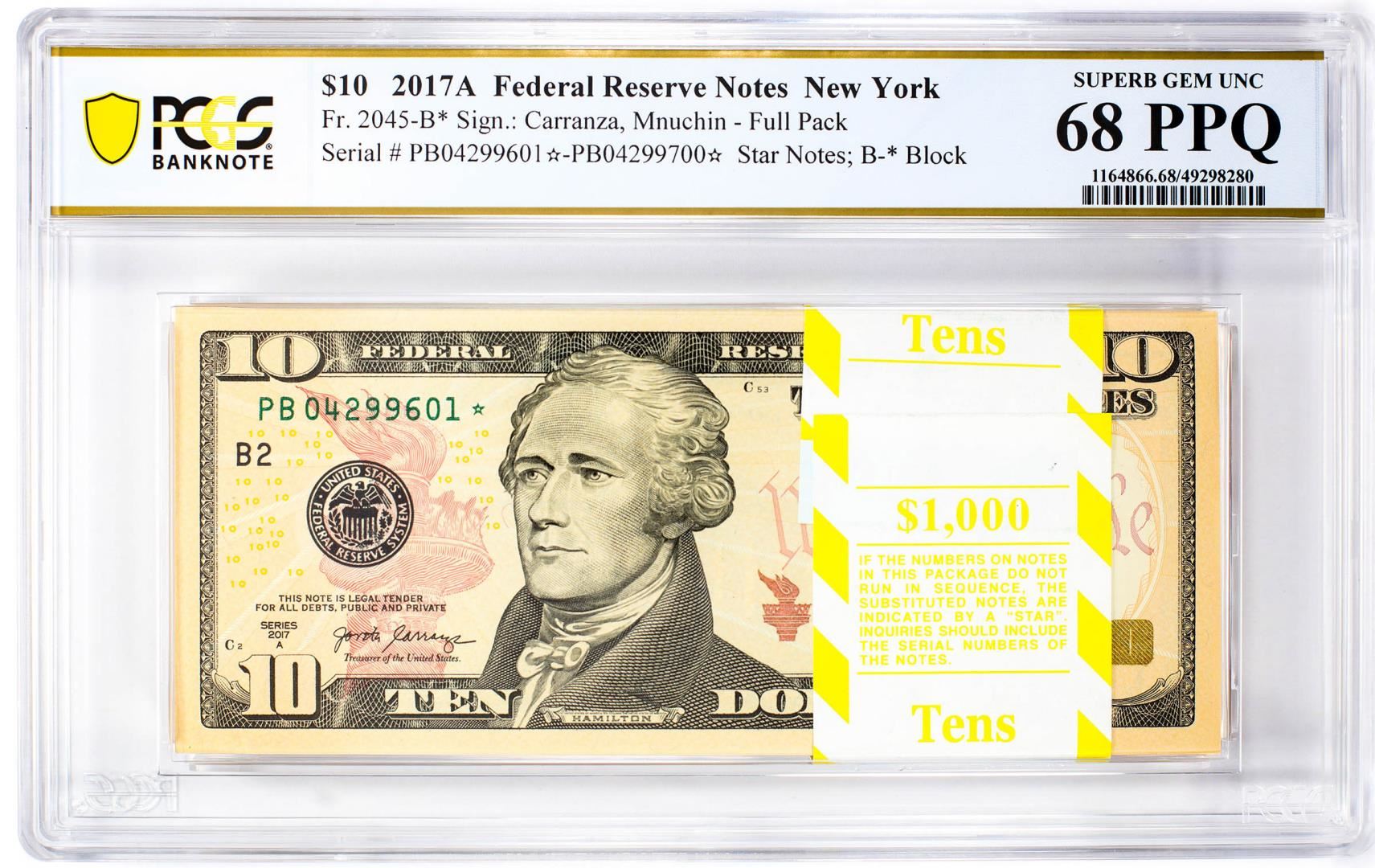 One Pack of 2017A $10 Federal Reserve STAR Notes NY Fr.2045-B* PCGS Superb Gem UNC 68PPQ. PCGS Graded.