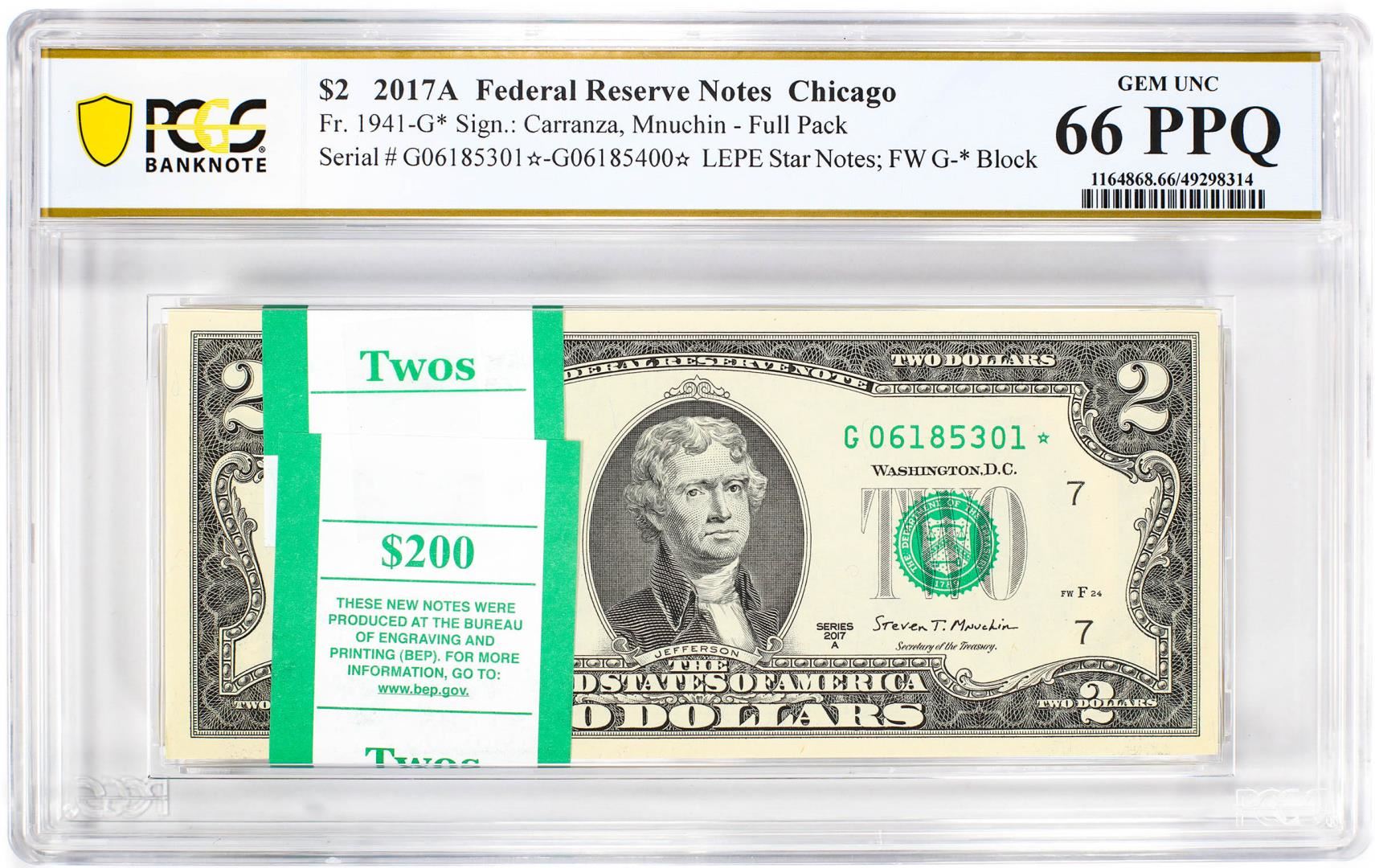 One Pack of 2017A $2 Federal Reserve STAR Notes Chicago Fr.1941-G* PCGS Gem UNC 66PPQ. PCGS Graded.