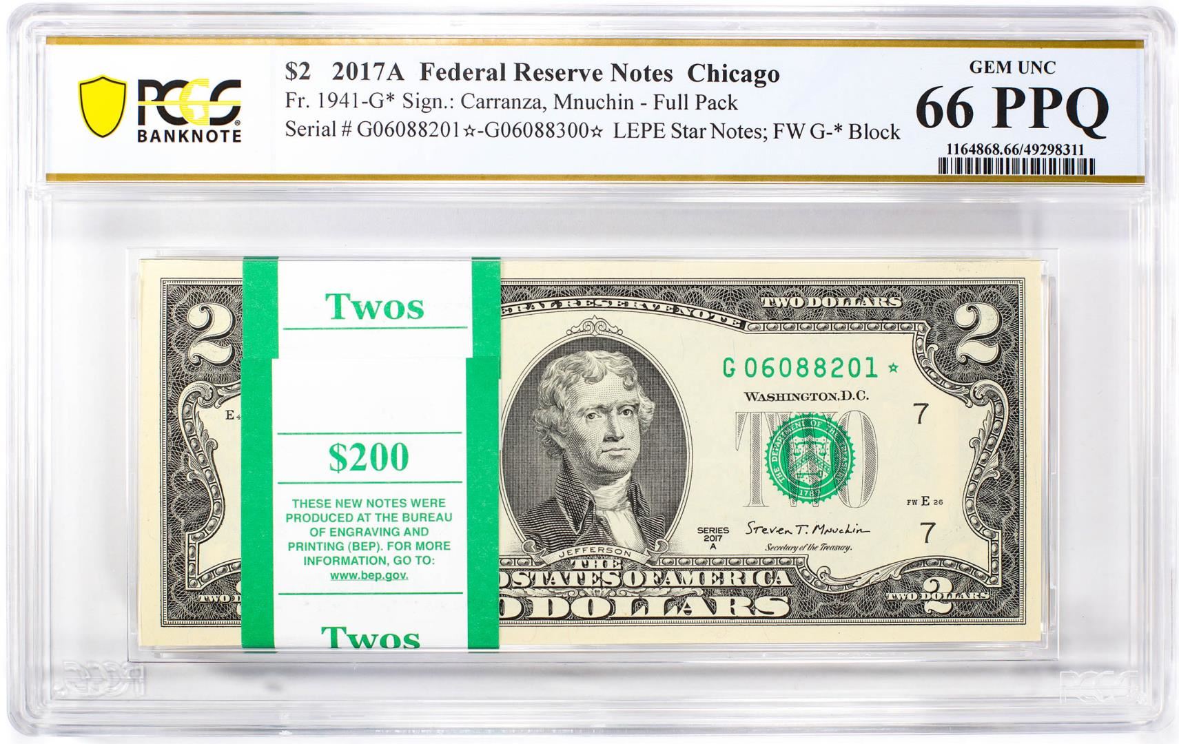 One Pack of 2017A $2 Federal Reserve STAR Notes Chicago Fr.1941-G* PCGS Gem UNC 66PPQ. PCGS Graded.