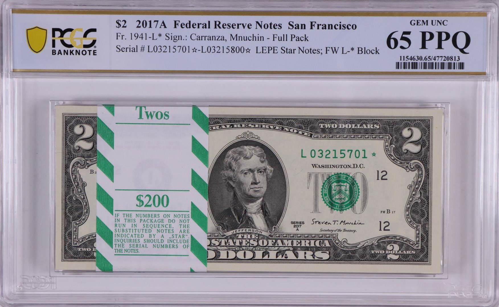 One Pack of 2017A $2 Federal Reserve STAR Notes SF Fr.1941-L* PCGS Gem Uncirculated 65PPQ. PCGS Graded.