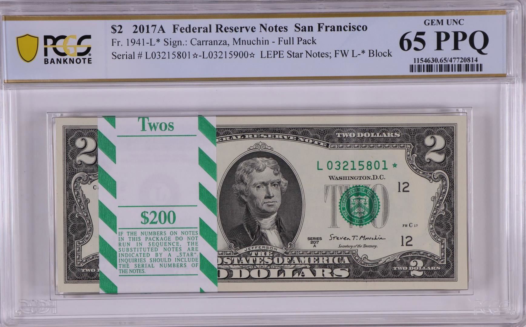 One Pack of 2017A $2 Federal Reserve STAR Notes SF Fr.1941-L* PCGS Gem Uncirculated 65PPQ. PCGS Graded.