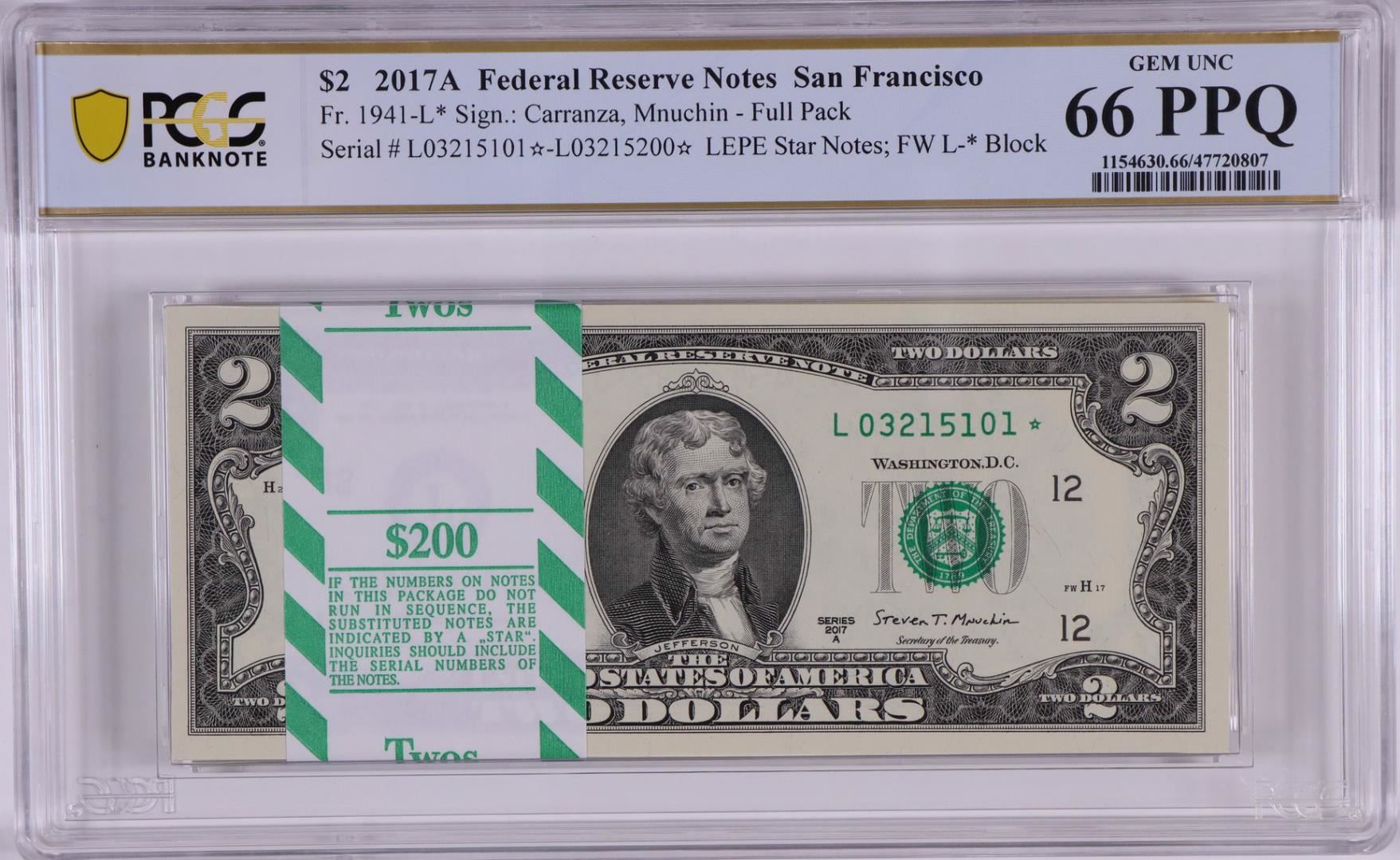 One Pack of 2017A $2 Federal Reserve STAR Notes SF Fr.1941-L* PCGS Gem Uncirculated 66PPQ. PCGS Graded.