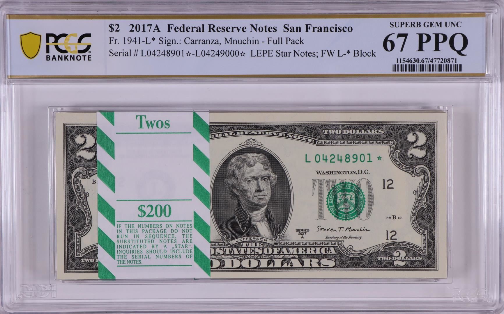One Pack of 2017A $2 Federal Reserve STAR Notes SF Fr.1941-L* PCGS Superb Gem UNC 67PPQ. PCGS Graded.